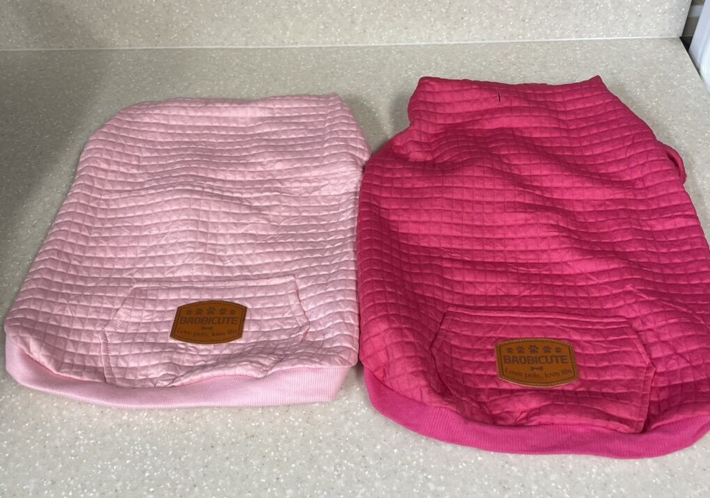 VenmoBEAUTYZOO Dog Hoodie, specifically featuring a waffle-like laminated cotton fabric. The hoodie includes a leather-style patch with the brand's name, BAOBICUTE, and the slogan Love pets, love life. Product Features Design: A three-piece fitted hoodie that includes a leash hole for easy attachment and functional pockets. Material: Crafted from a waffle-like laminated cotton fabric that is designed to be warm, breathable, and stretchy. Suitability: Available in various sizes, from small to large breeds, and is appropriate for multiple seasons, including spring, autumn, and winter. Rose pink and pink - both for $10