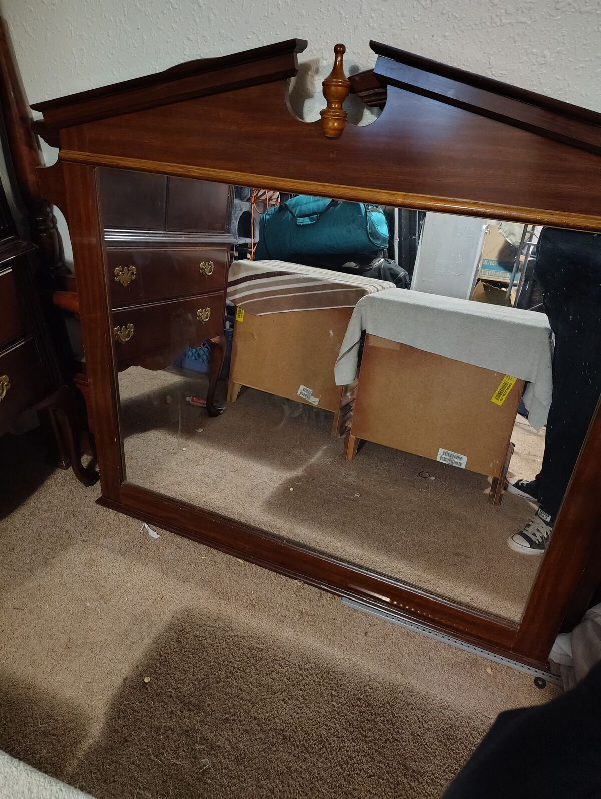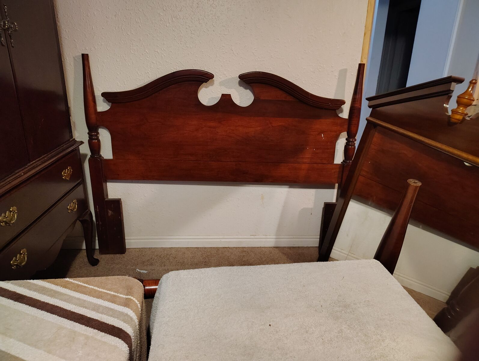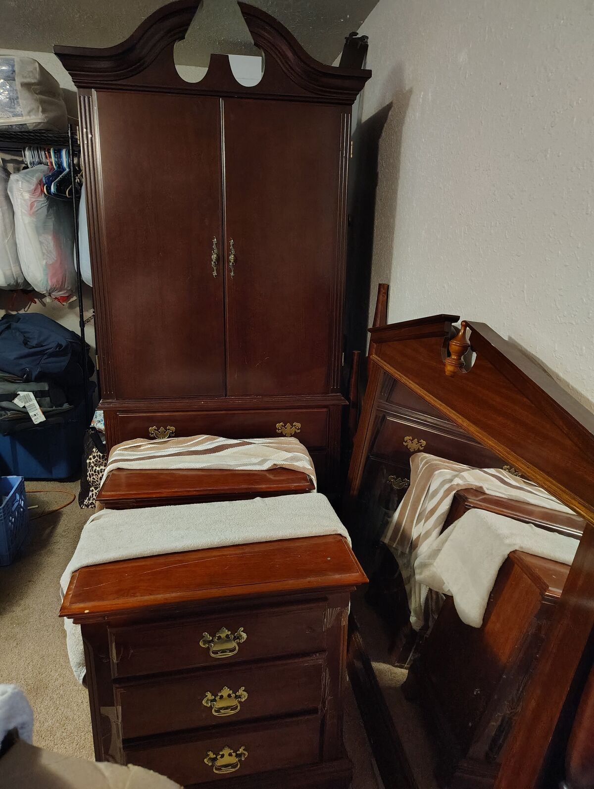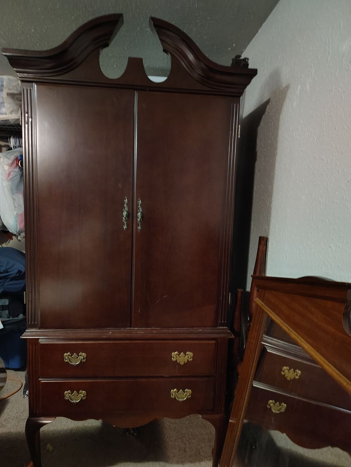 Good condition made strong durable The armoire is pretty tall it comes in two pieces however it's no bigger than any other armor I have a full dresser with 5 big full drawers two nightstands with two drawers in each stand also a headboard and foot board with bed rails for a queen or full size bed no mattress no box spring only the wooden frame set itself all matching Captain a non-smoking environment I'm moving I need it gone. I am willing to work with the payment and you can venmo cash app PayPal and chime me or cash accepted first come first serve I cannot hold it because I need to be gone by the 10th of February