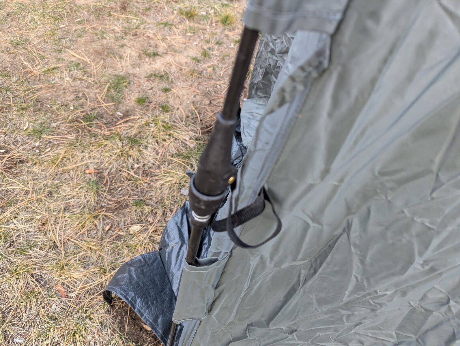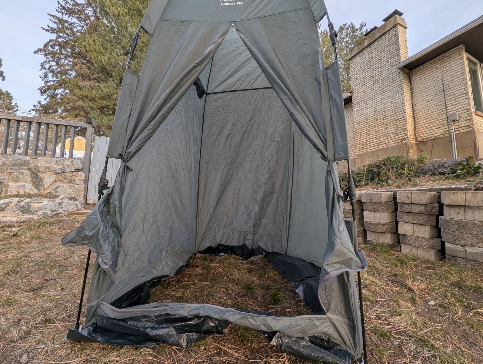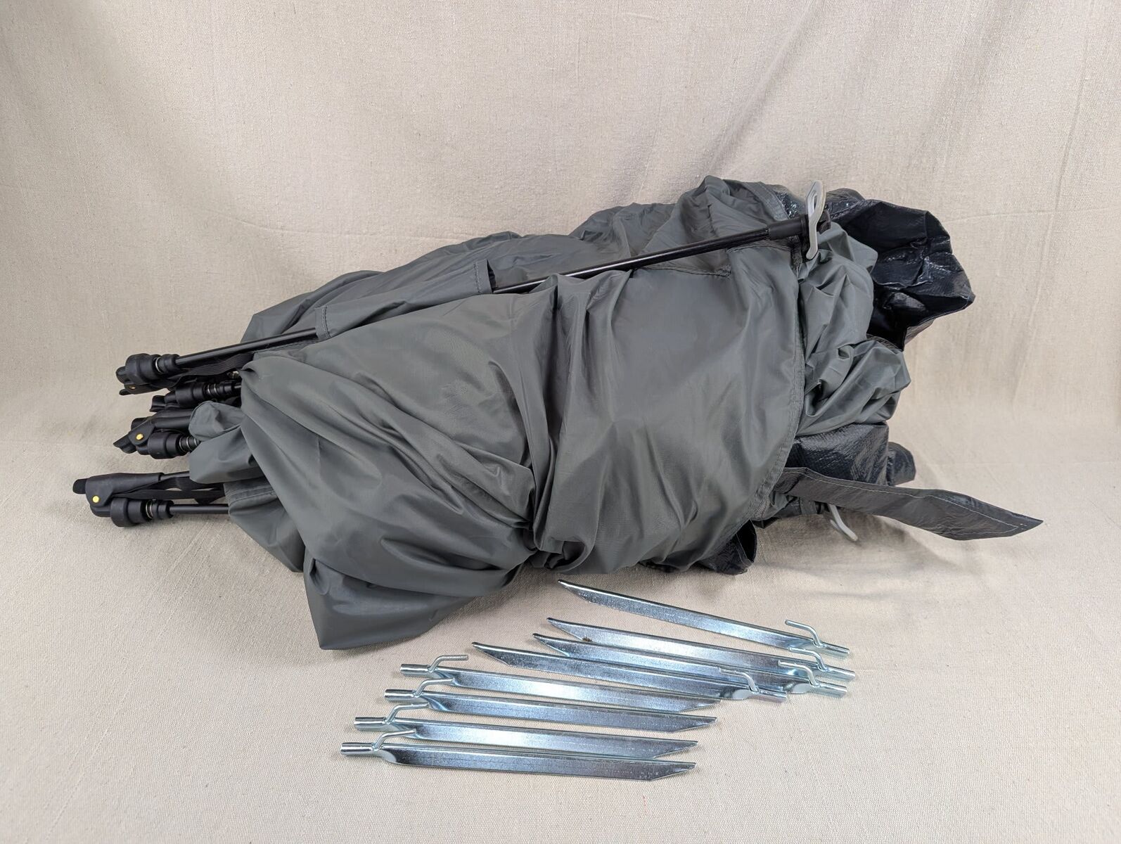 The privacy shelter is in excellent condition. Minor markings are present. Some dirt is present on the stakes. The stuff sack for the ground unit is missing. Support poles, springs, and hinges are in good condition and function.