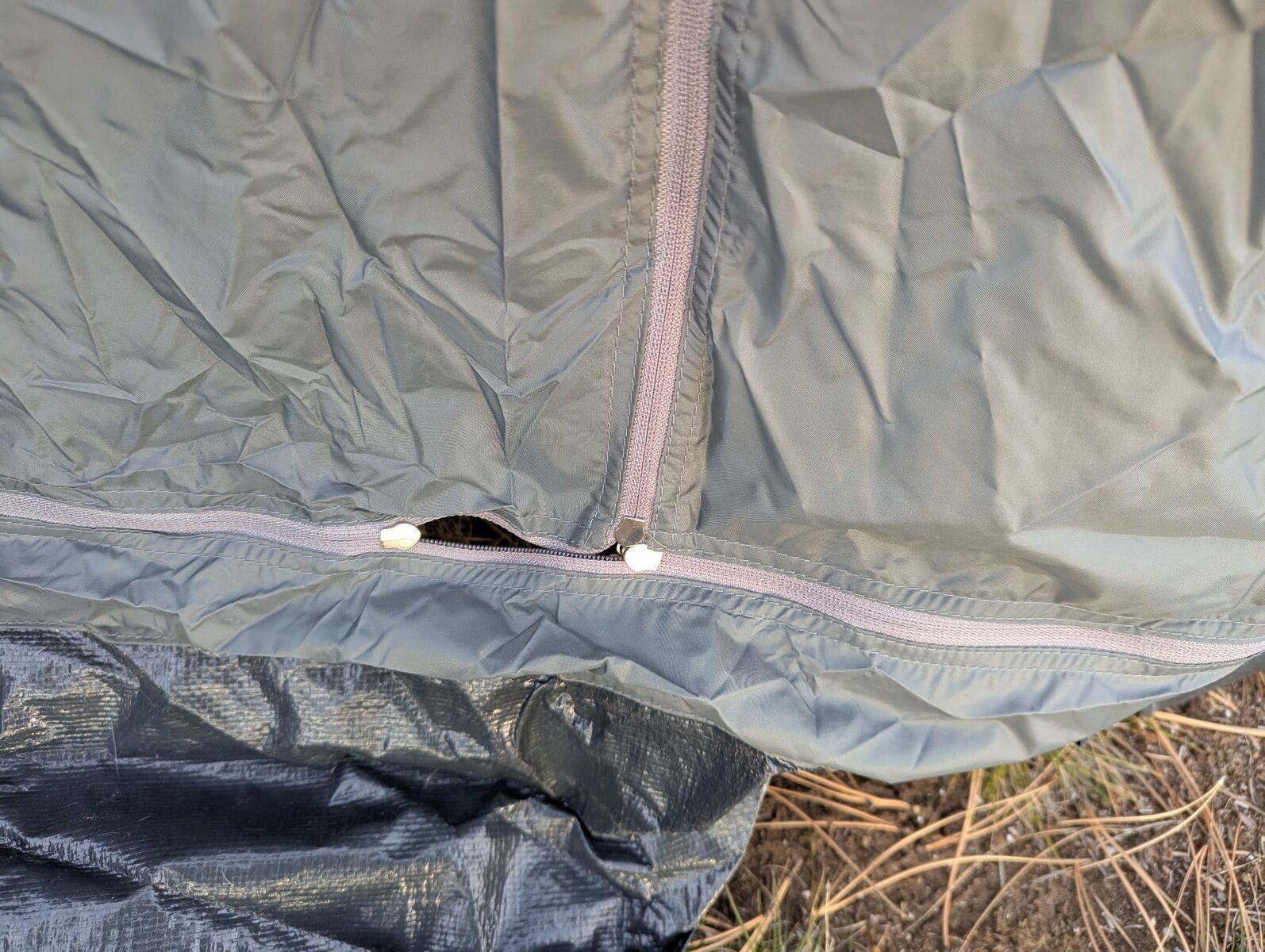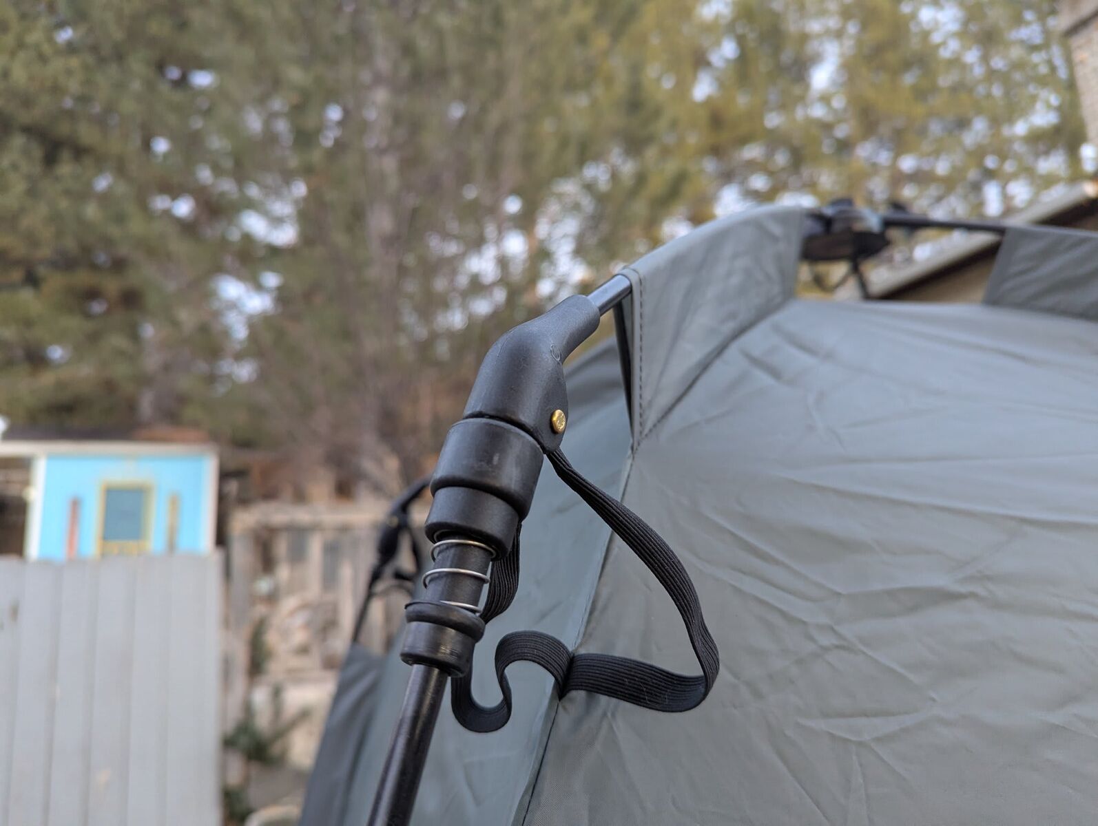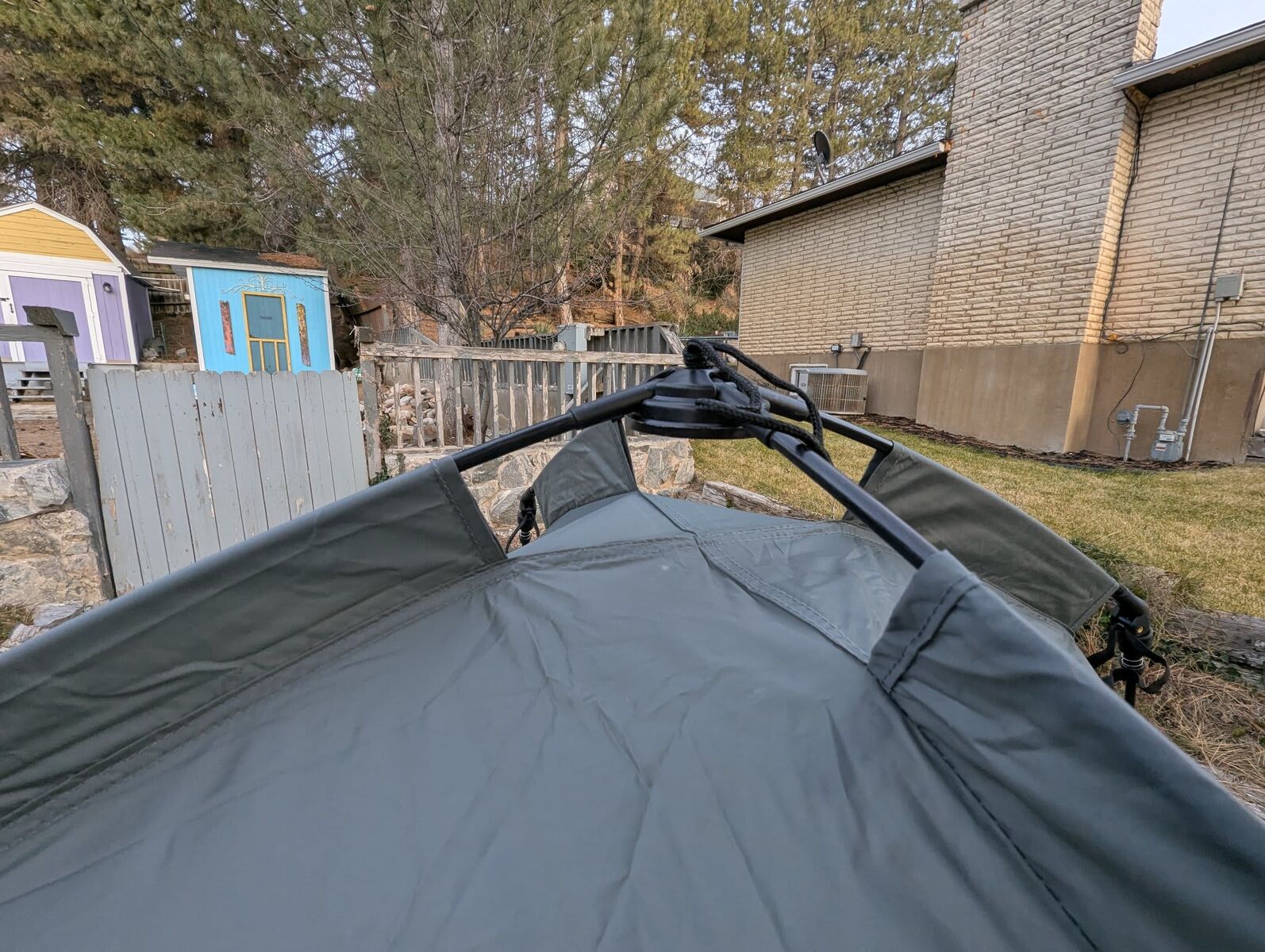 The privacy shelter is in excellent condition. Minor markings are present. Some dirt is present on the stakes. The stuff sack for the ground unit is missing. Support poles, springs, and hinges are in good condition and function.