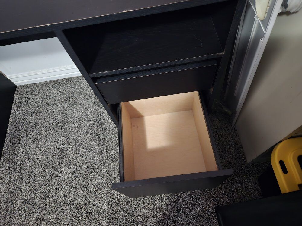 VenmoBlack desk. Has definitely been loved, has some scratches but otherwise is very solid. Two drawers, both work with no issues. Bottom drawer is made for folders/is a filing cabinet drawer. Text works best to get ahold of me.