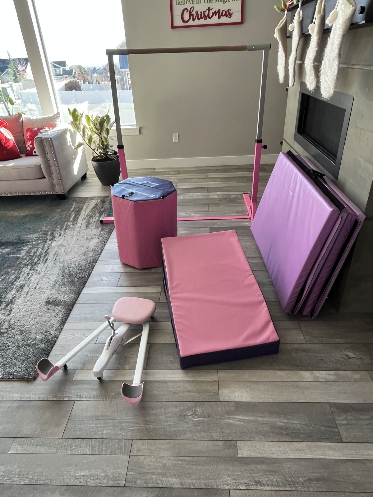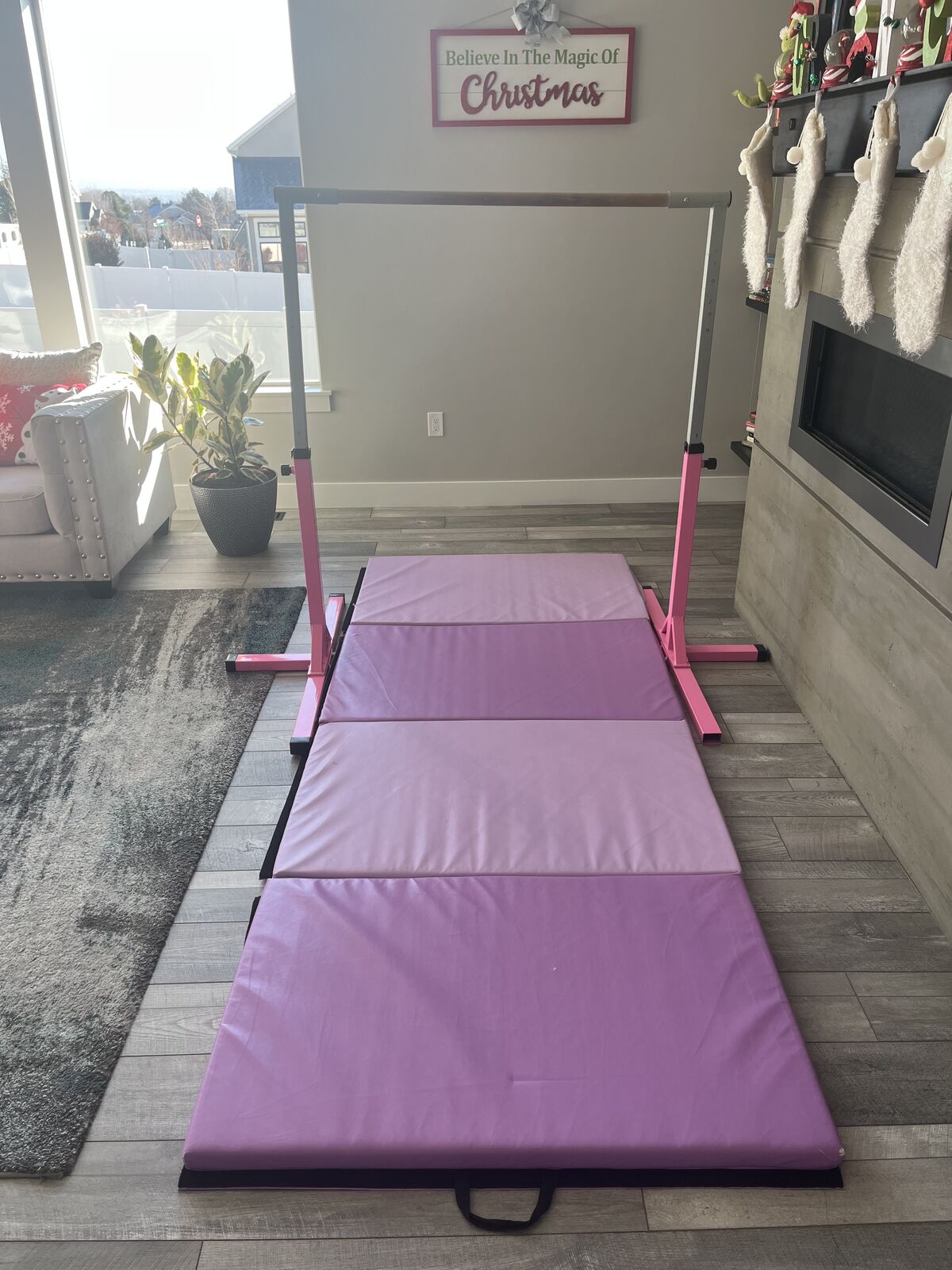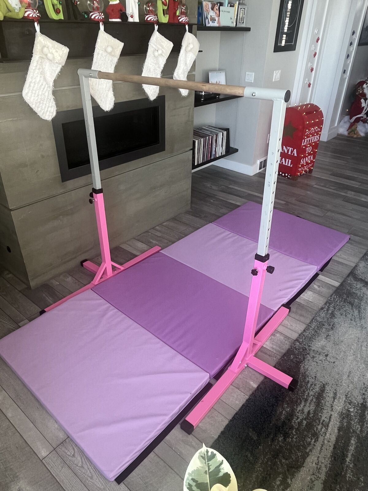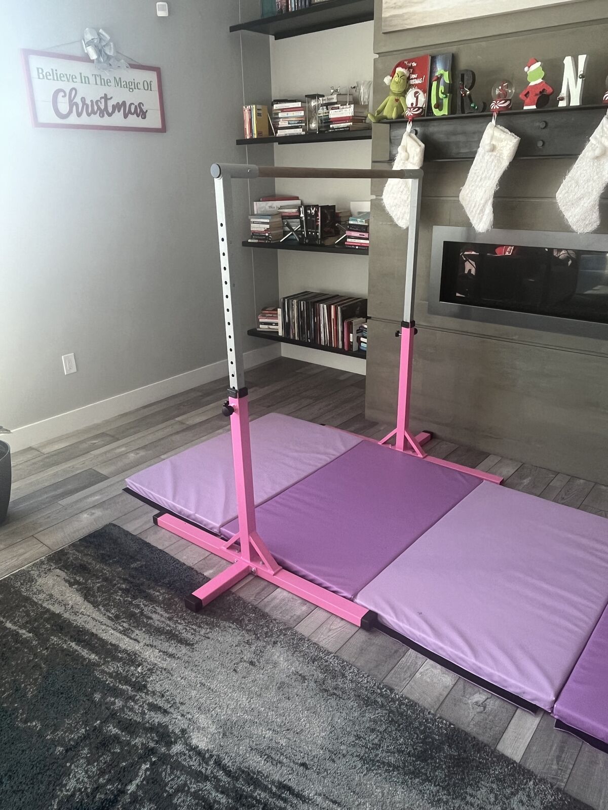 VenmoCheck out this amazing gymnastics/tumbling complete set GALORE!! Why am I selling it? Because my dreams of my daughter becoming a gymnast faded quickly once she discovered YouTube Kids! Note: my dreams of her being a ballerina also went down the drain. This pink and purple gymnastics set has all the goods and is in remarkably fantastic condition. As you can see from this photo shoot, there is a foldable purple mat, an adjustable bar (think Olympics 2038 uneven parallel bars are in your future), a cool rolly polly shape that I should know the name of, but it vanished with all my other elementary school memories after having kids, and a wedge that can stunt double for your son's Hot Wheels ramp. There is also an amazing contraption that enhances flexibility and will make you wish you didn't attempt a demo at my age. Feel free to Google Lens all of these and get the deets on Amazon. Reach out with any questions that I most likely can't answer, and don't waste my time scamming me. I clearly have bigger fish to fry... like battling screen-time limits for an 8-year-old. Pick up only