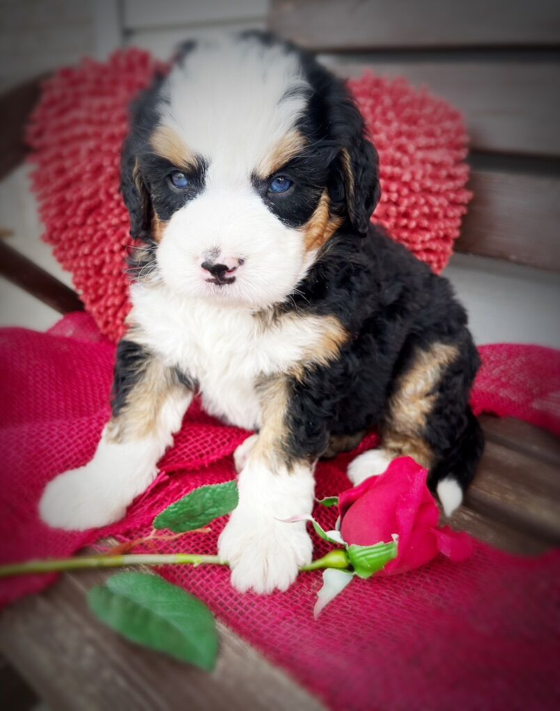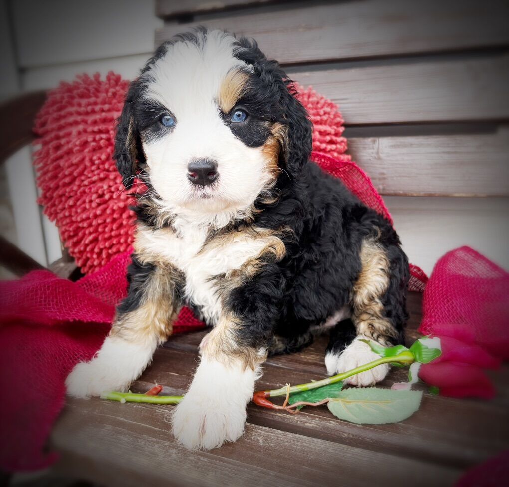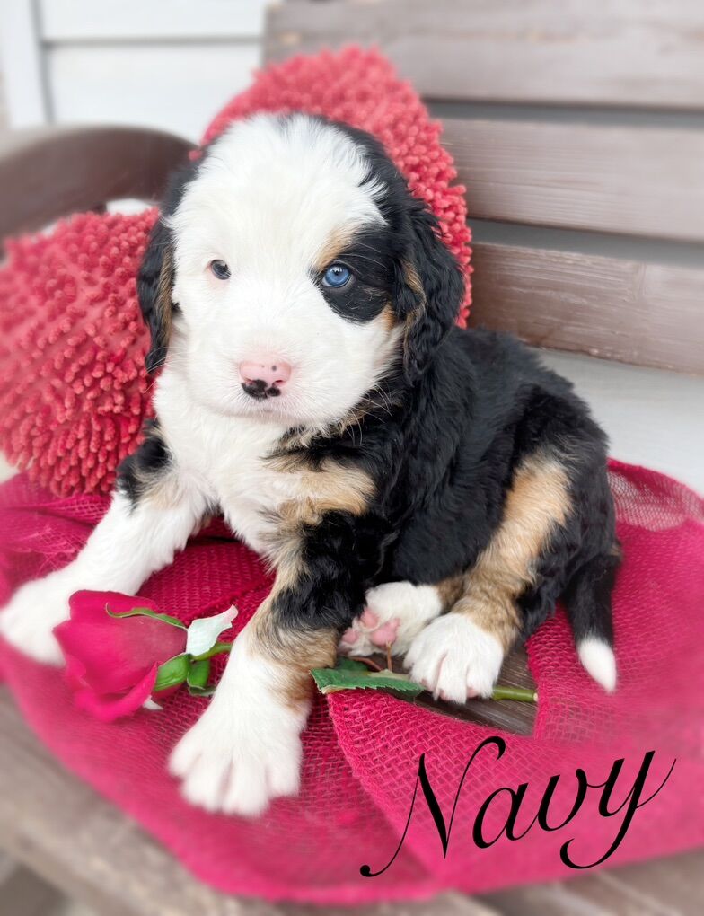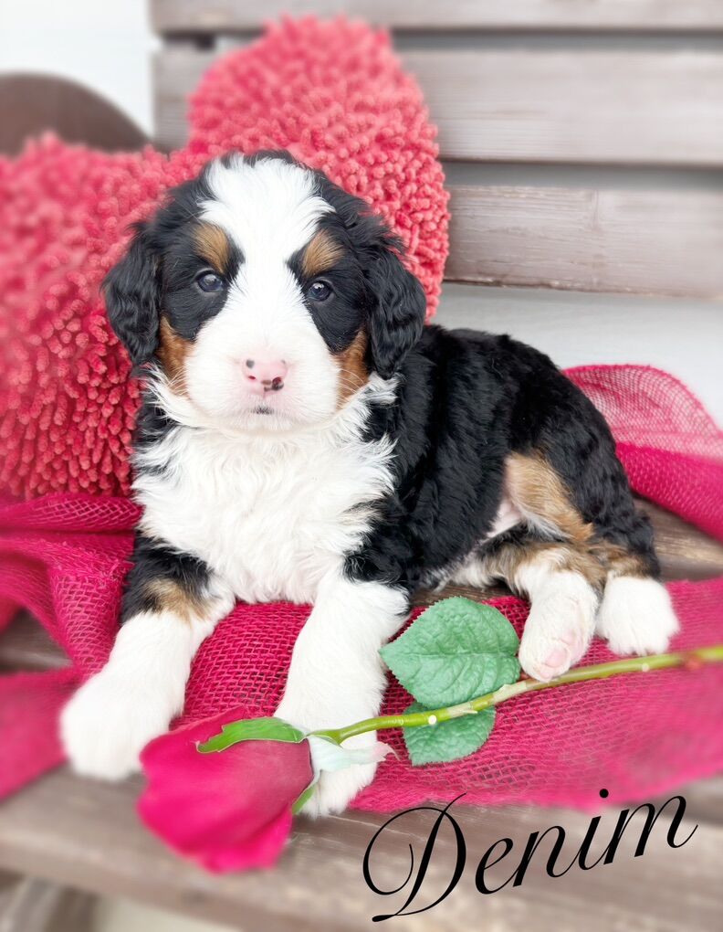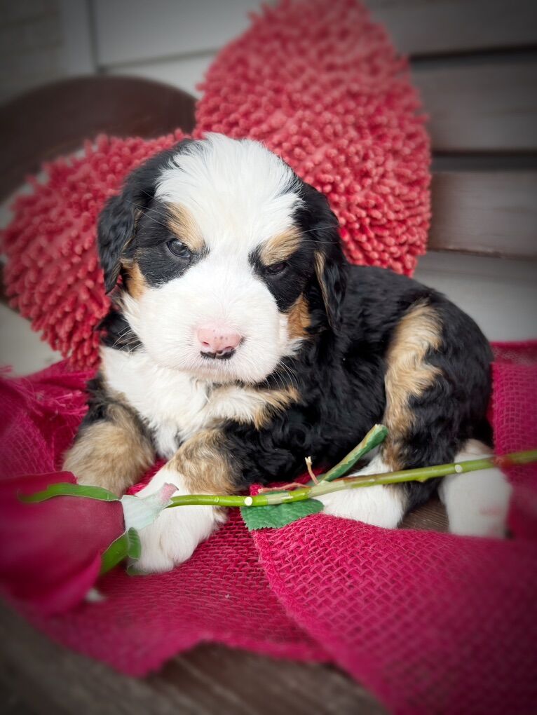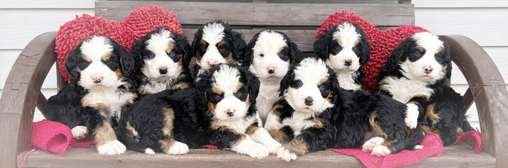 This is our first litter of Ultra Bernedoodles, and this is also Skye’s first litter of puppies, so we’re extremely excited to see how they turn out, but with that in mind we are not certain on adult size or how the coats will turn out. Most are wavy right now, some are straight, all will be soft, with one copy of furnishings.