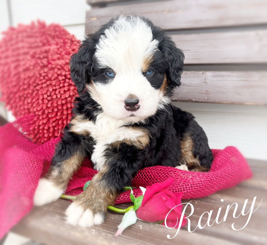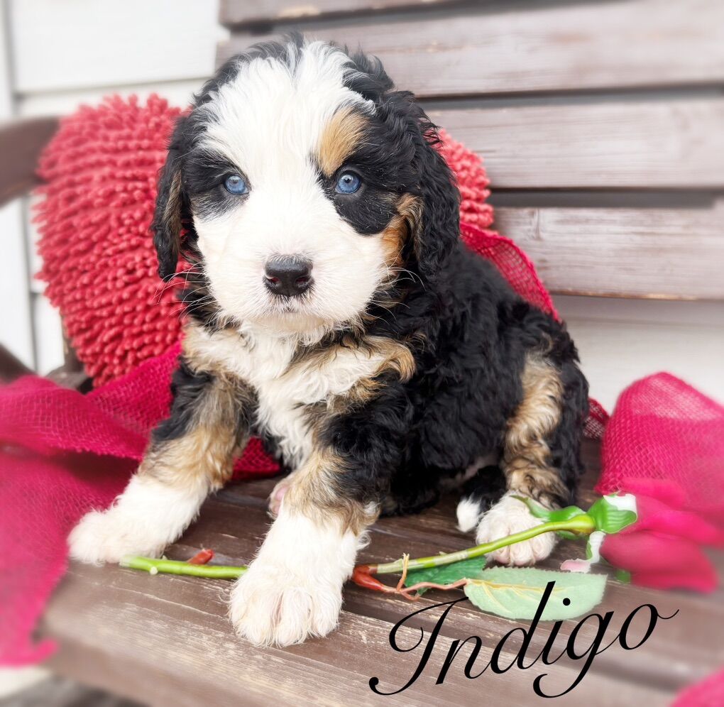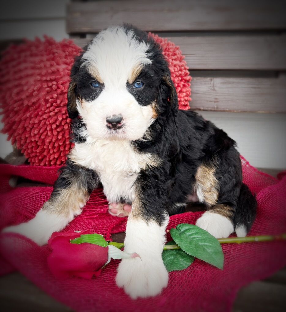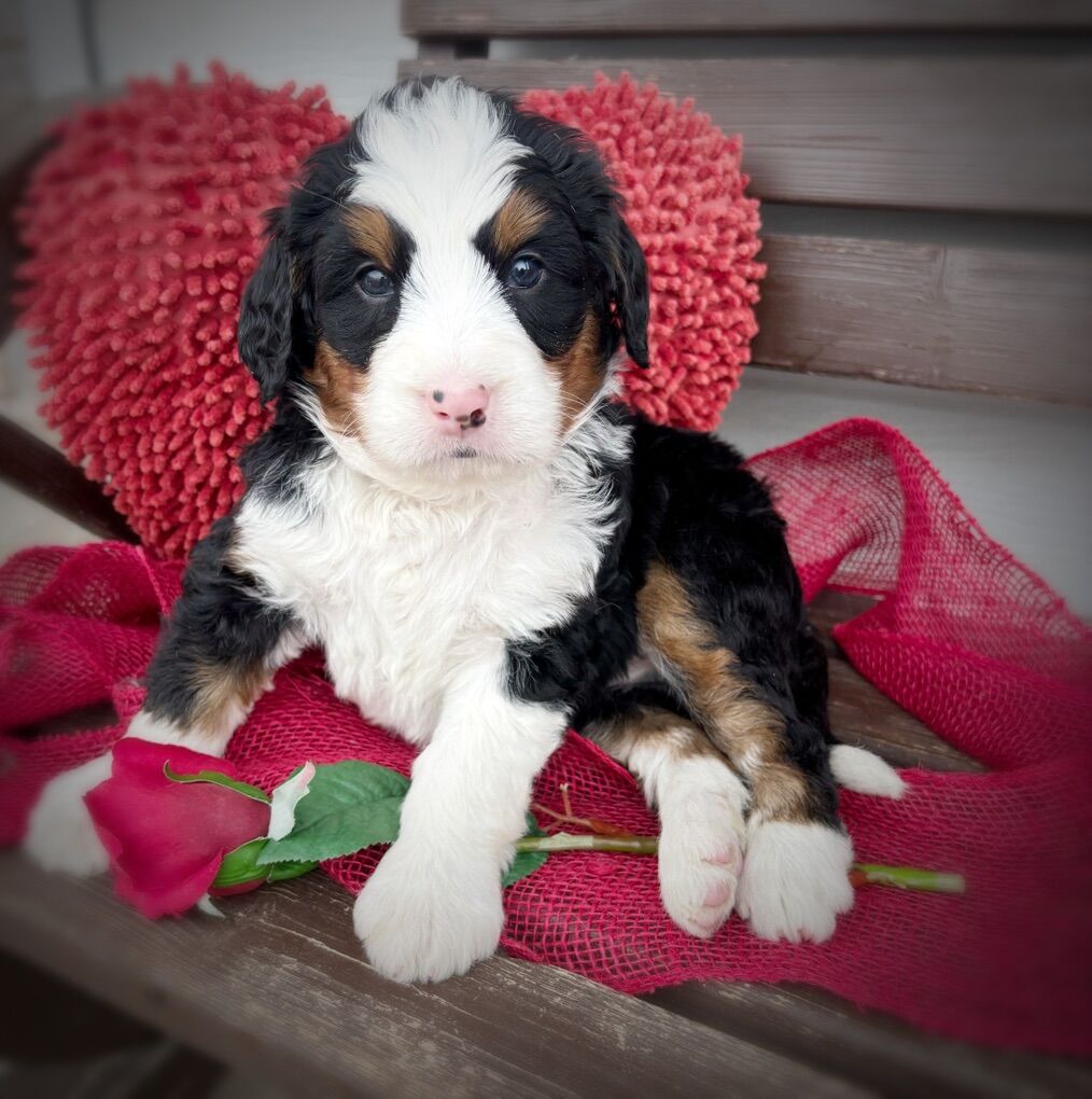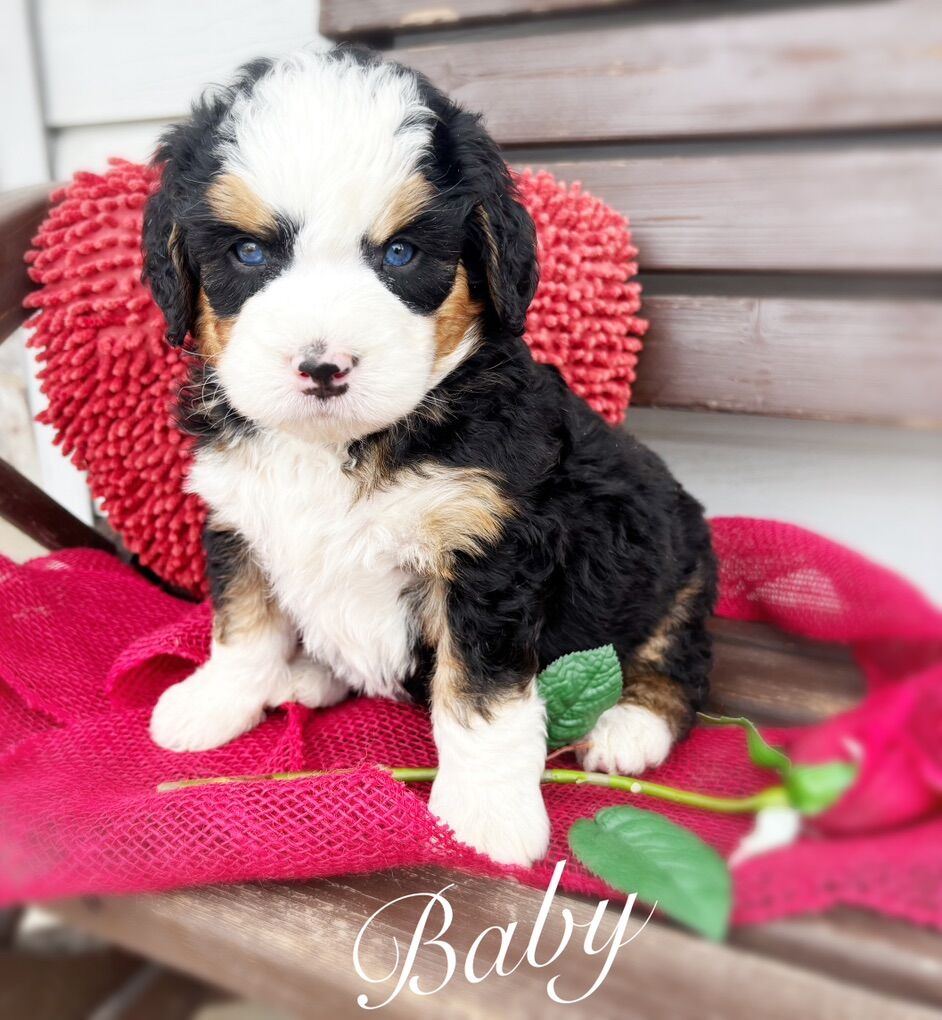 This is our first litter of Ultra Bernedoodles, and this is also Skye’s first litter of puppies, so we’re extremely excited to see how they turn out, but with that in mind we are not certain on adult size or how the coats will turn out. Most are wavy right now, some are straight, all will be soft, with one copy of furnishings.