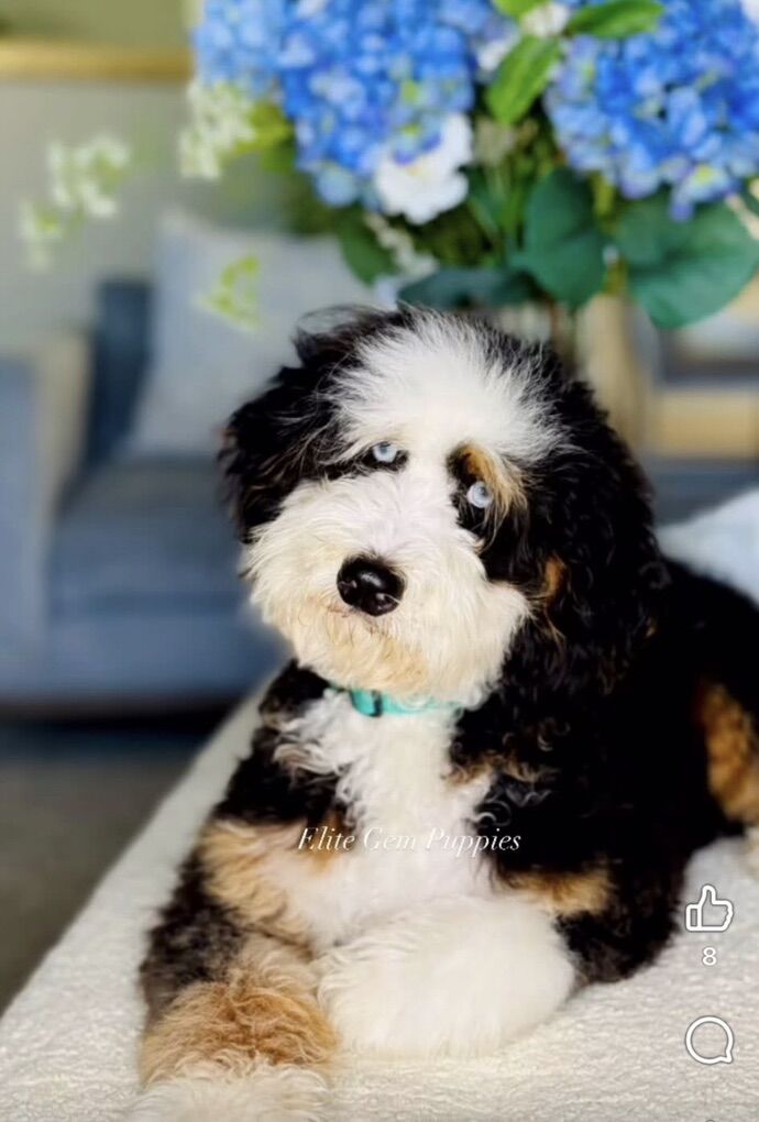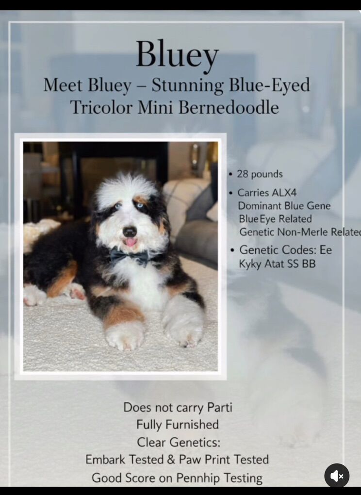 Our stud, Bluey has 2 blue eyes which is rare, and carries the rare ALX4 gene which will likely produce blue eyes in most of these puppies as well. They will all be the traditional black Tri color like the Bernese. A bonus for breeders is that this stud does not carry the parti gene. He is double furnished. Skye is our beautiful, single blue eyed purebred AKC Bernese Mt Dog, 83lbs, 2yrs old, genetically clear through Embark. Fantastic coat and the sought after loving personality of the Bernese.