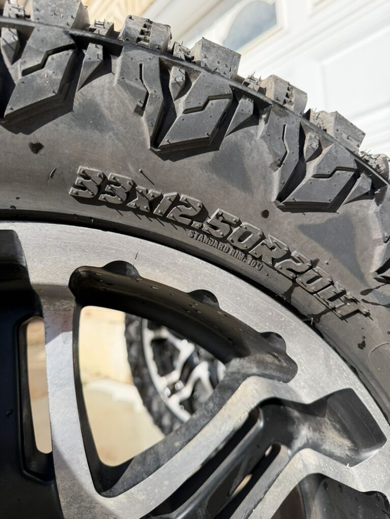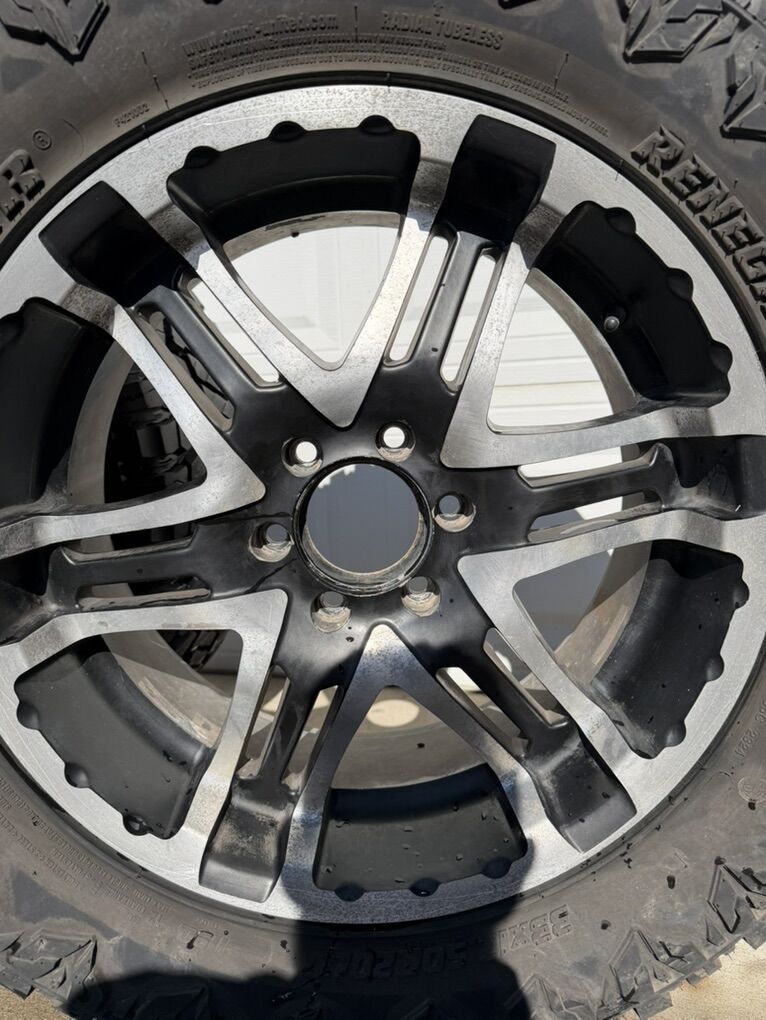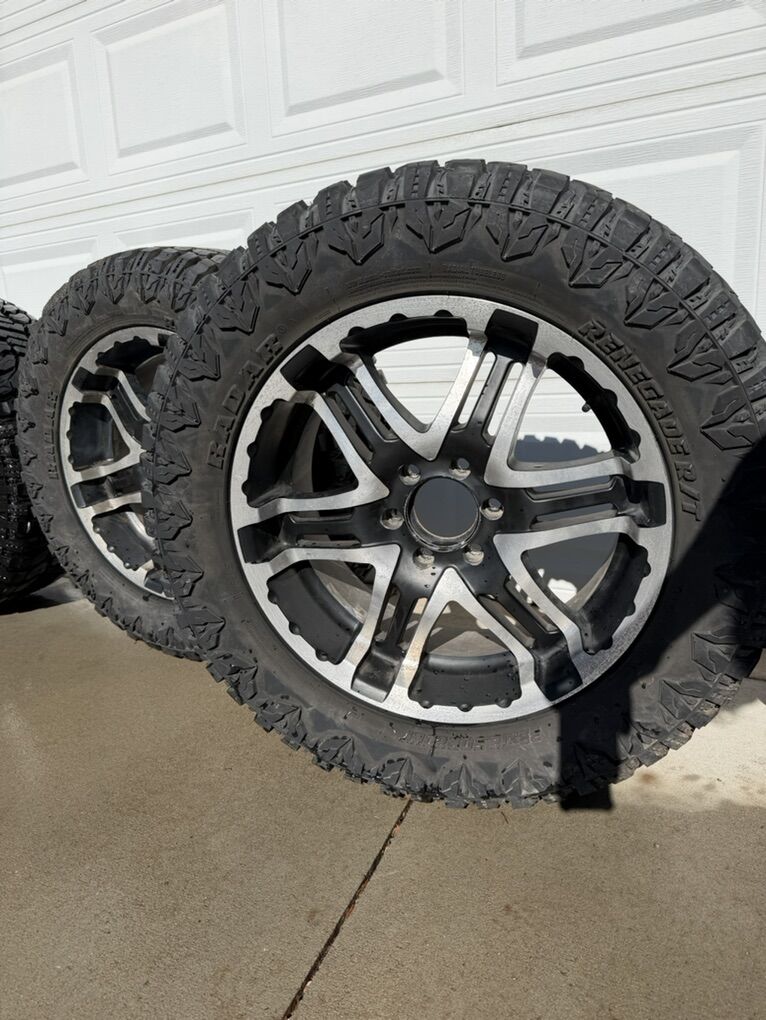 ZelleSelling this set of truck wheels and tires. Tires- Radar Renegade R/T 33x12.50 R20 pretty much brand new. They have less than 100 miles on them. Wheels- I do not remember the brand but they are nice. 6 lug. I had them on an f150 $1500 Willing to negotiate but no low ball offers please.