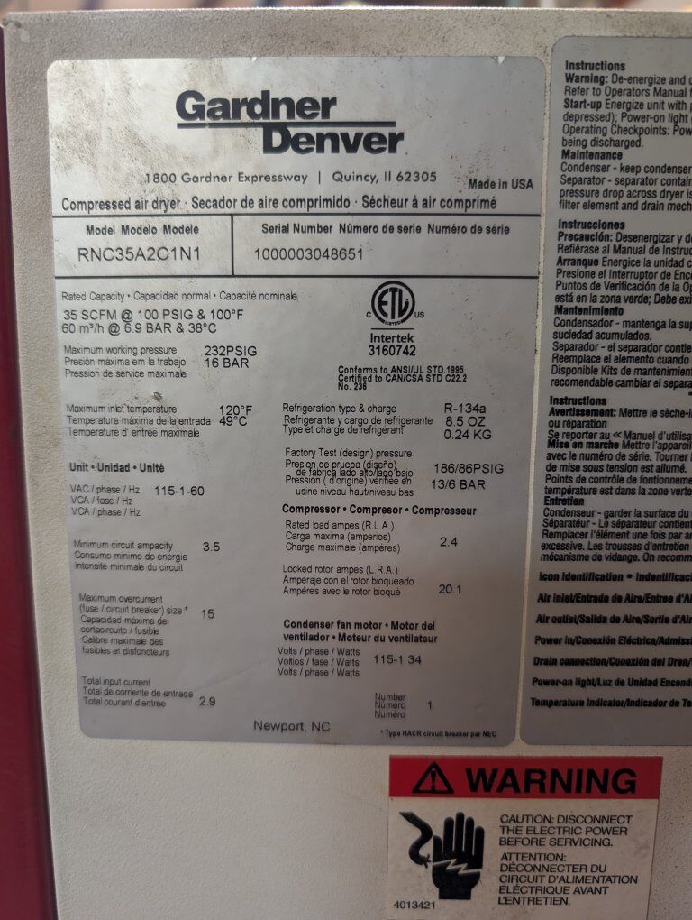 I also have a Gardner Denver high capacity Air dryer. It squeals a little bit on startup but runs great.