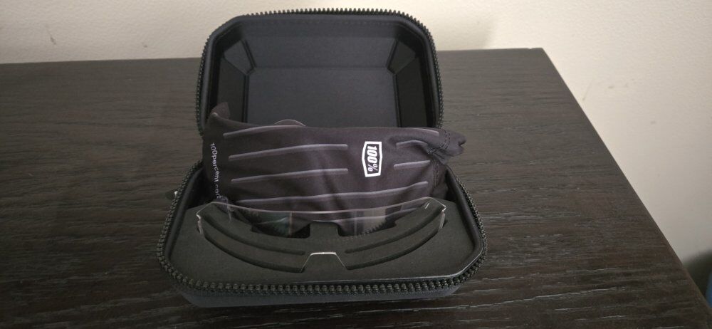 100% S3 w/gray frame, 1 dark lens, 1 clear lens, travel case, and microfiber glasses pouch.