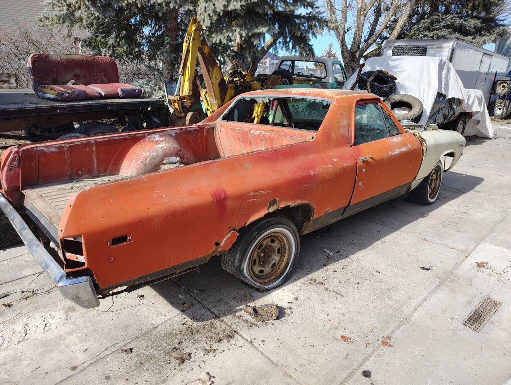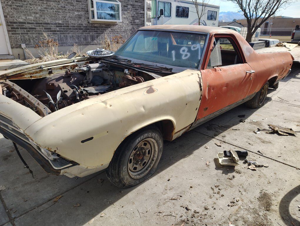 1969 Chevy El Camino has a small block 350 that is seized has quite a bit of rust both quarters need to be replaced floor pans and fenders I do not have a hood for it. is a factory AC car I do have a 69 396 short block and a turbo 400 transmission and a set of 1966 396 or 427 closed chamber heads that will turn that 396 short block into a 390 horse 396. All will need to be rebuilt and go with the car. also have a factory forged crank never machined that I would throw in for another 350$ for the 396 no title but I am trying to get one.