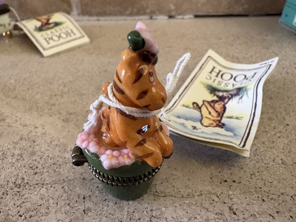 I have 3 small porcelain Classic Winnie the Pooh trinket boxes with hinged lids. They are in like new condition with the boxes, tags and packaging. There is a tigger, a piglet and a rectangle with Pooh & Piglet. They were made by Midwest at Cannon Falls. Tigger is the tallest at just under 2 inches. The Piglet one has a smaller removable butterfly inside and Tigger has a removable flower. These are usually $25-$60 each online. I’m asking $45 for all of them together. See my other ads for jewelry, artwork, home decor and more.