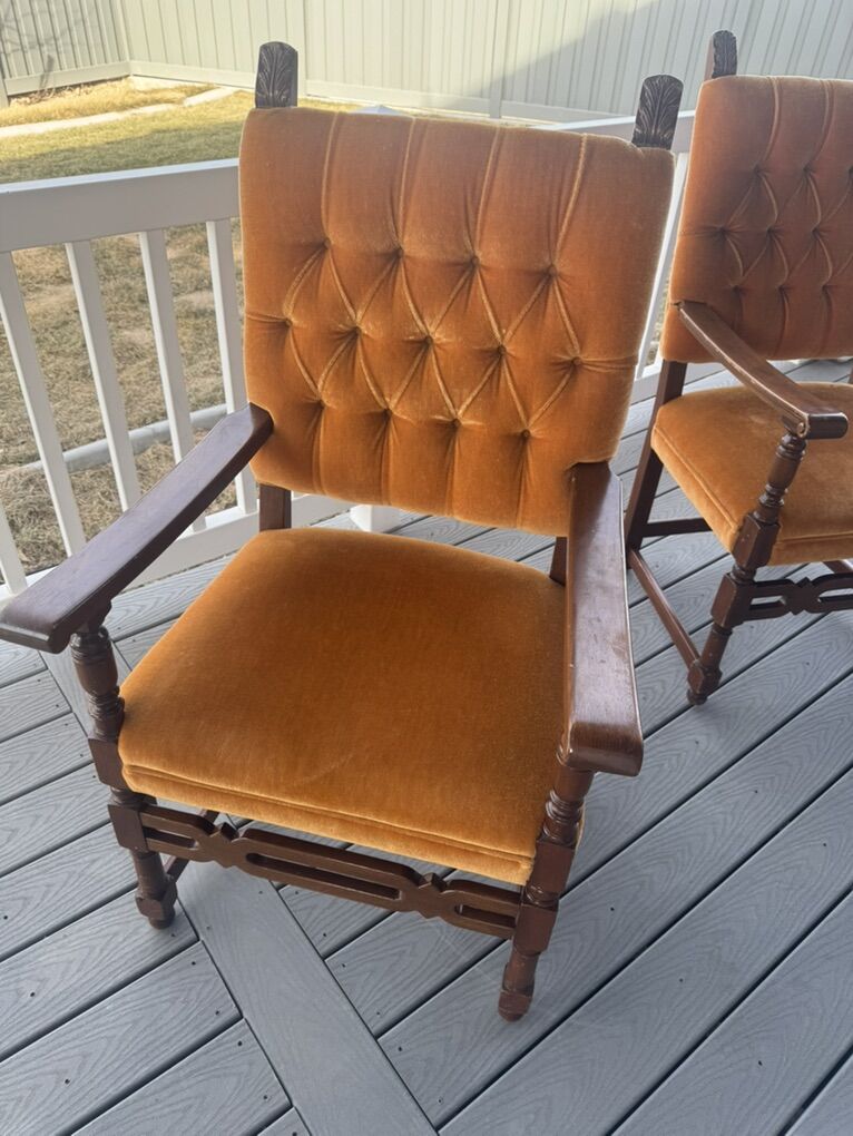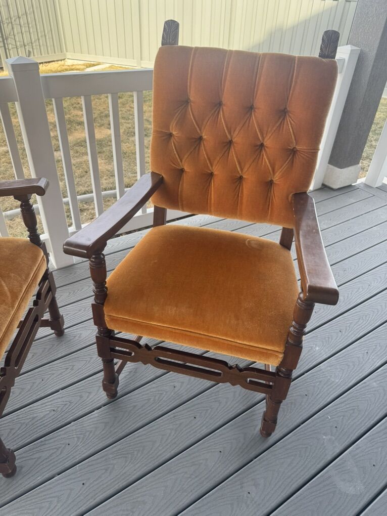VenmoStunning pair of authentic vintage tufted velvet armchairs with rich burnt orange upholstery and solid, heavy wood frames. These are true vintage pieces with real craftsmanship — not modern reproductions.