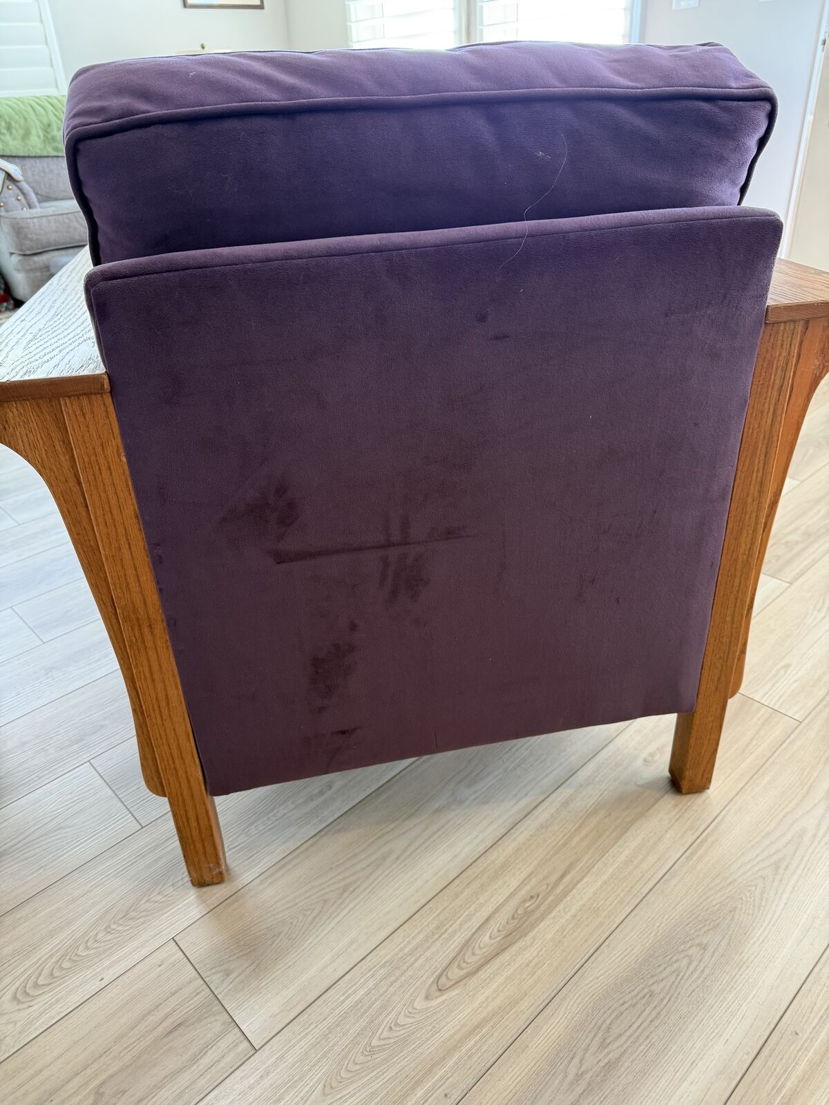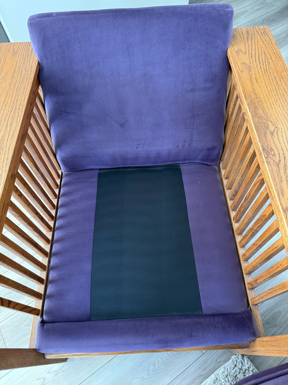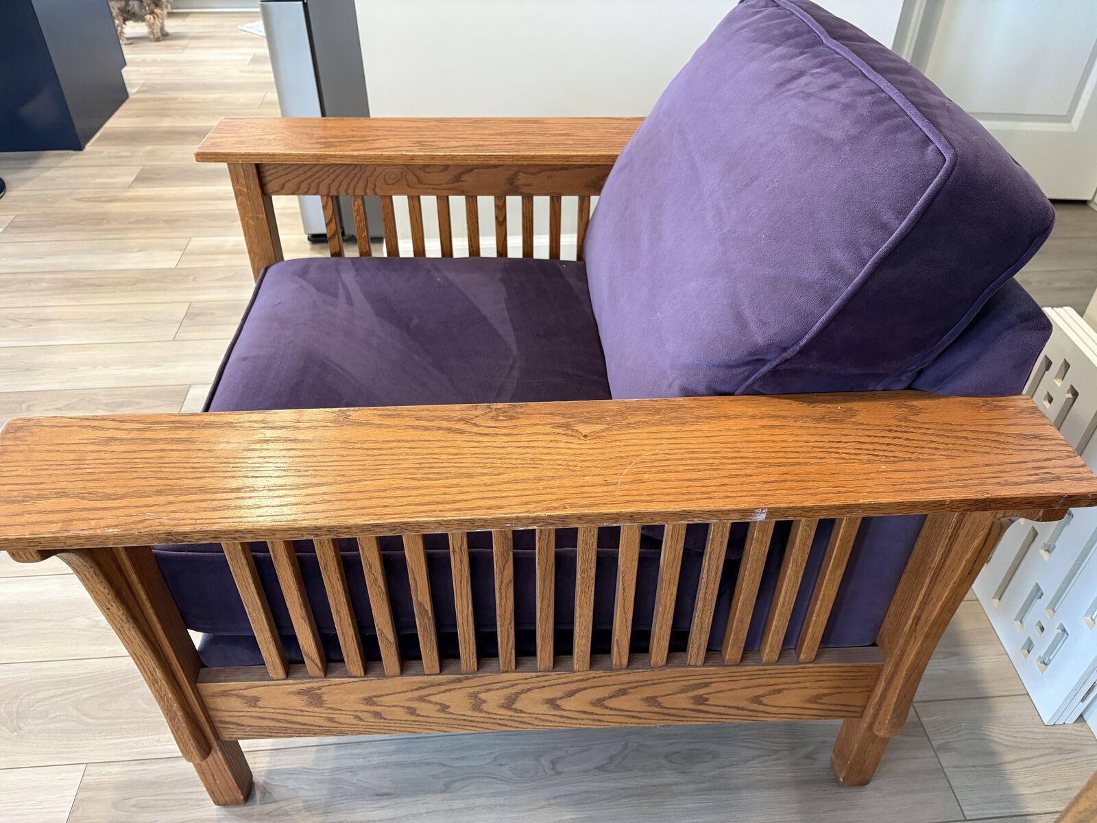PayPalVintage mission style oak bassett couch and chair. Good condition. These are pieces of furniture that will last forever. The couch and chair were re-upholstered in 2013. The material is an eggplant color. There is some wear on the oak finish but otherwise the two pieces are in good condition,