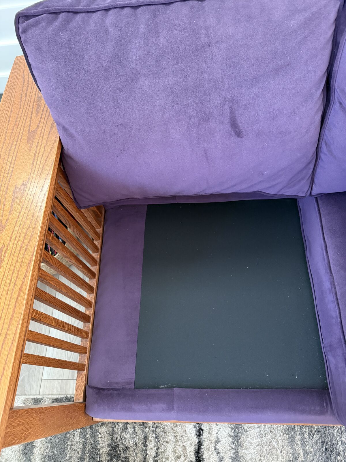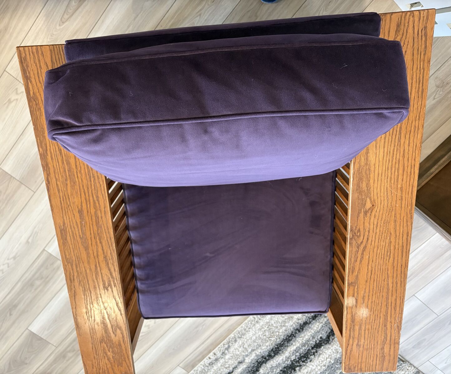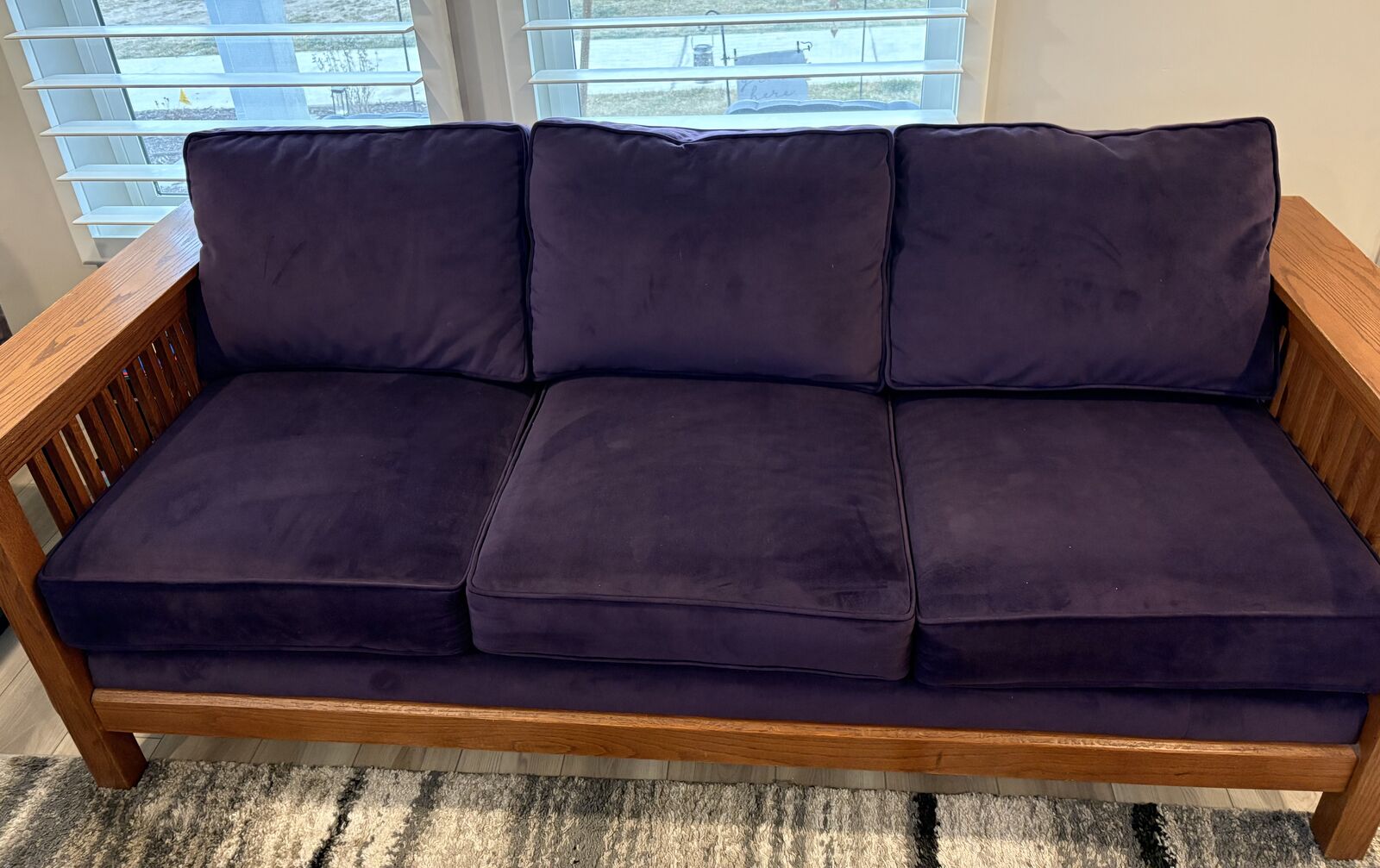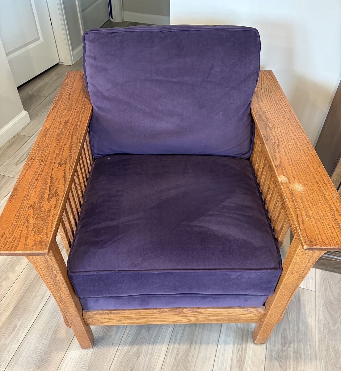 PayPalVintage mission style oak bassett couch and chair. Good condition. These are pieces of furniture that will last forever. The couch and chair were re-upholstered in 2013. The material is an eggplant color. There is some wear on the oak finish but otherwise the two pieces are in good condition,