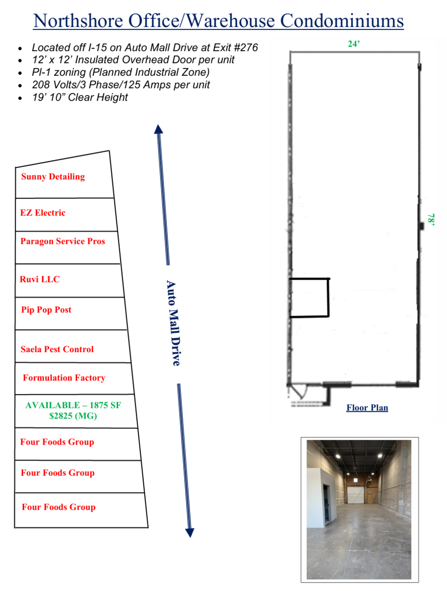 1875 SF of warehouse space available February 1st. This unit is 3 minutes from the I-15 on ramp, clean, has a brand new office-quality restroom, a 12' x 12' overhead garage door, and 19' 10" of clear height. The rent is $2825 per month not including utilities. Landlord pays property taxes, maintenance fees, and trash/sewer. Call today to schedule a showing!