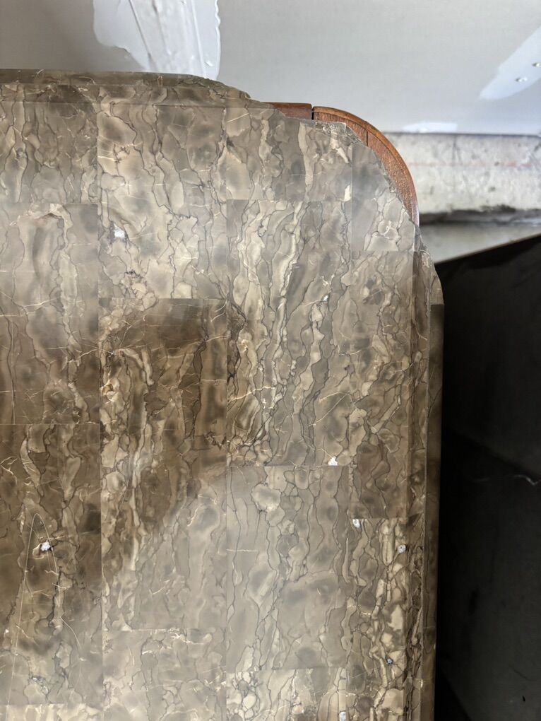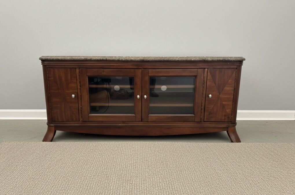 VenmoElevate your living room with this heavy, high-quality media console. This is a substantial piece of furniture featuring a beautiful, thick marble top and a rich dark wood finish with classic diamond-veneer detailing on the side cabinets.