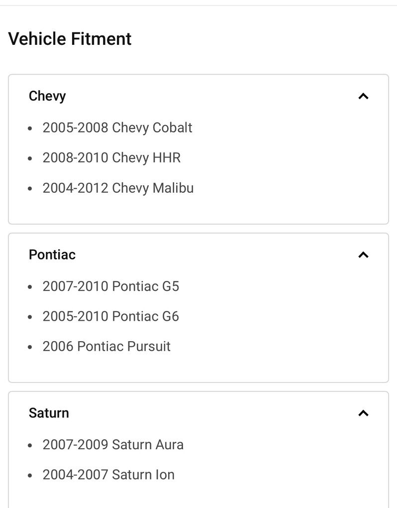 Chevy 2005-2008 Chevy Cobalt 2008-2010 Chevy HHR 2004-2012 Chevy Malibu Pontiac 2007-2010 Pontiac G5 2005-2010 Pontiac G6 2006 Pontiac Pursuit Saturn 2007-2009 Saturn Aura 2004-2007 Saturn Ion