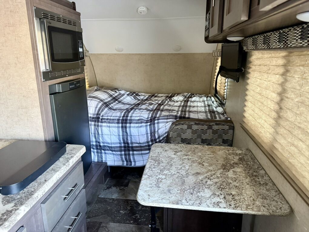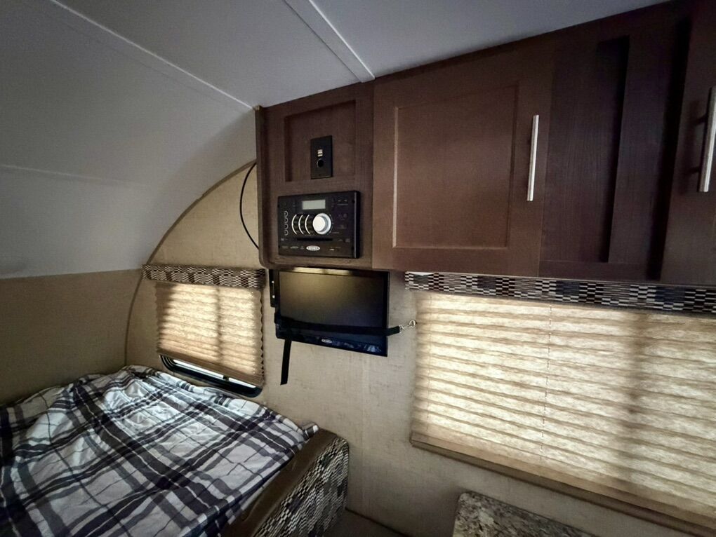 Second owner of this 2017 R-Pod. Two new batteries and a new water pump installed late 2024. Tires replaced in 2022 and have minimal wear. Two solar panels on roof that charge the batteries during the day. Electric jack. Box spring mattress. The kitchen area has an electric pop-out that makes the space feel much roomier. Overall in pretty good condition inside and out. Everything works. There are some slight delamination bubbles on one side that have been there since the previous owner and haven’t gotten any worse. Let me know if you have any questions.