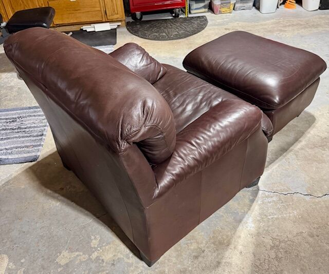 Price reduced: Large all-leather chair and matching ottoman. Stylish, great shape, very comfortable, well made, and should last for years.