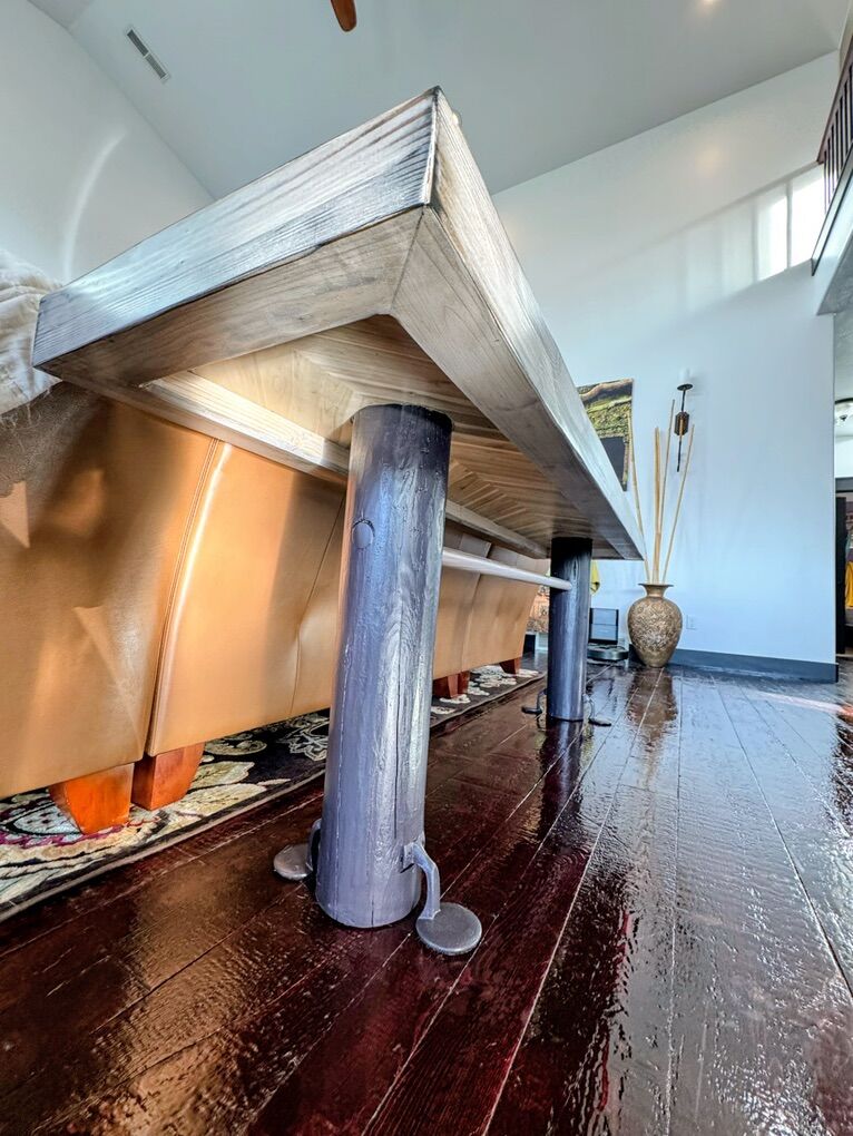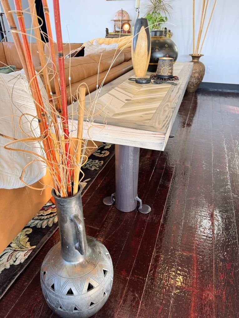 GooglePayJust finished. I built this table to last a lifetime. Solid wood, Boho style design. Translucent white and black stain with satin polycrylic finish to protect the wood from scratches and spills. Multiple uses. Console, couch, entry, buffet, nook, breakfast table. Set at standard dinning room table height and just right for behind most couches. 28 1/2” Tall X 78 1/2” long and 19 1/4” wide. 6” round legs. Solid build, the table does not dismantle. I can also make another with the colors you choose.