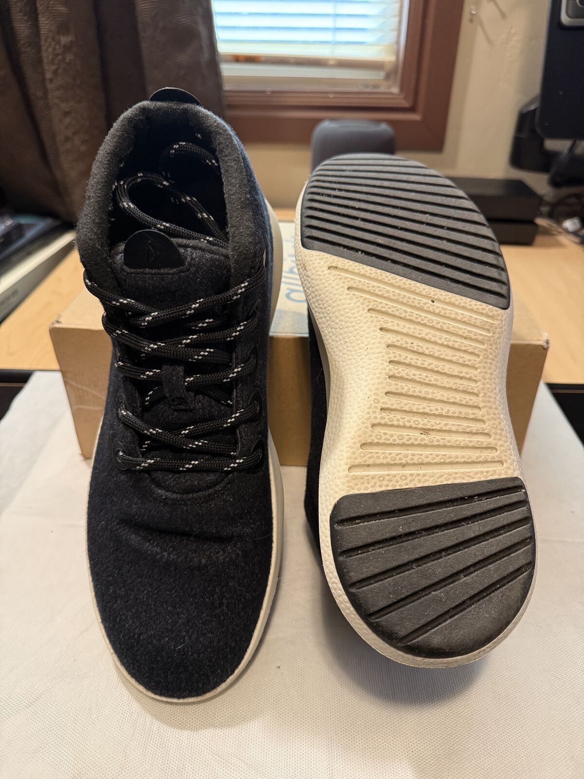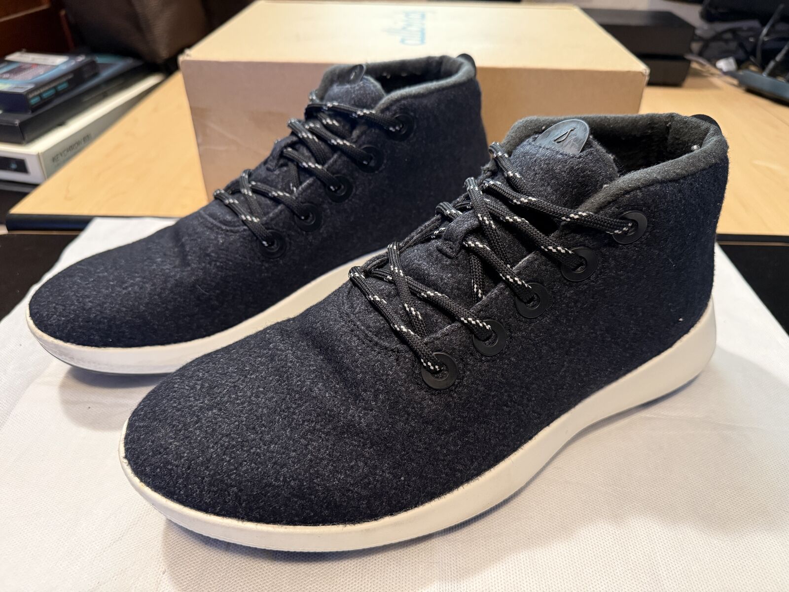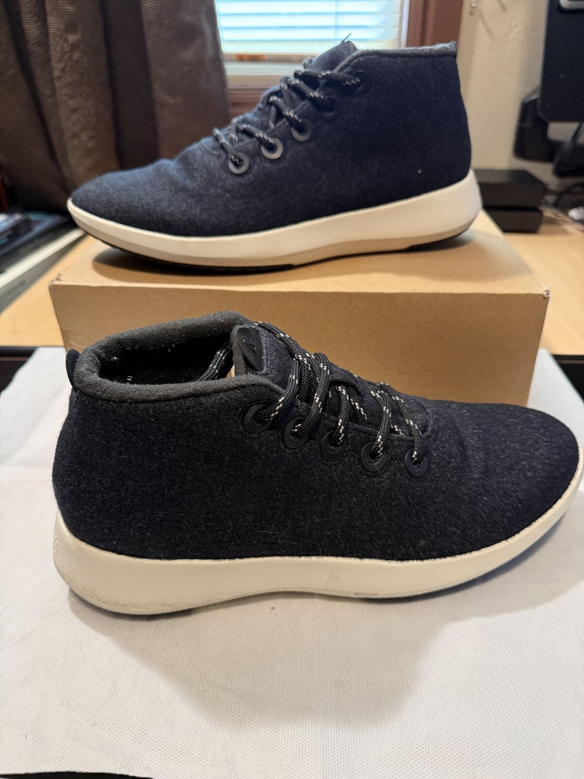 Allbird Wool Runner-Up Mizzles Mens 13 in Natural Black (Natural White) colorway. Lightly used and in great condition. These are the water-resistant high-top sneakers, perfect for Spring, Fall and light Winter weather. Very warm and confortable. Comes in original box and has been well cared for.