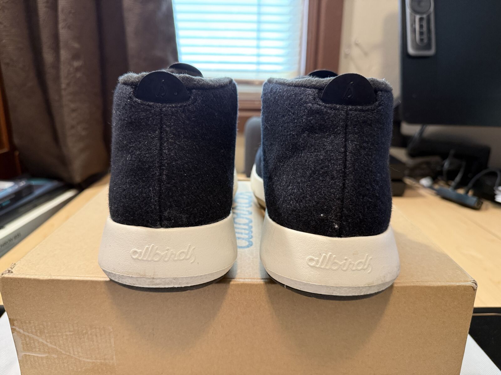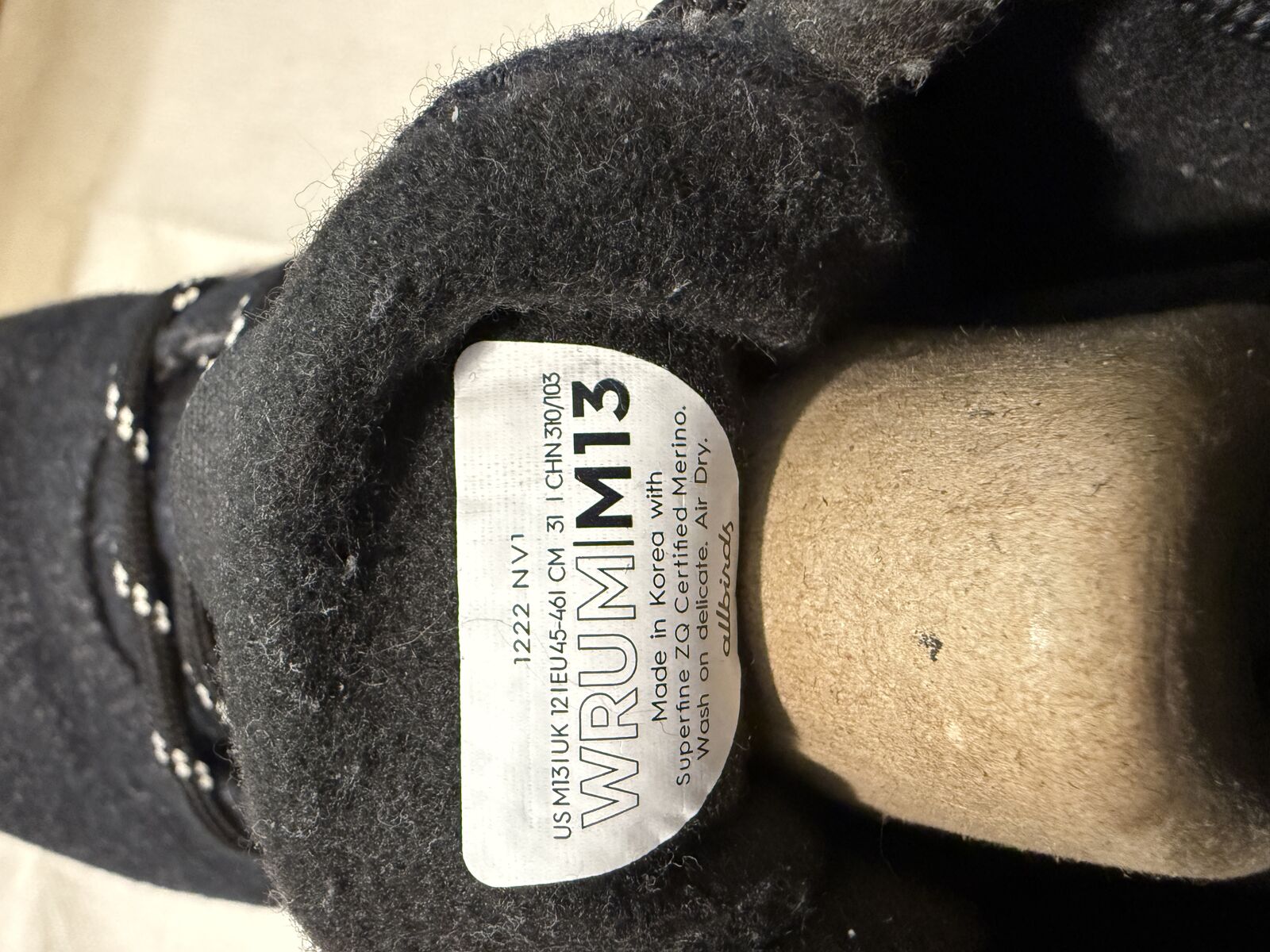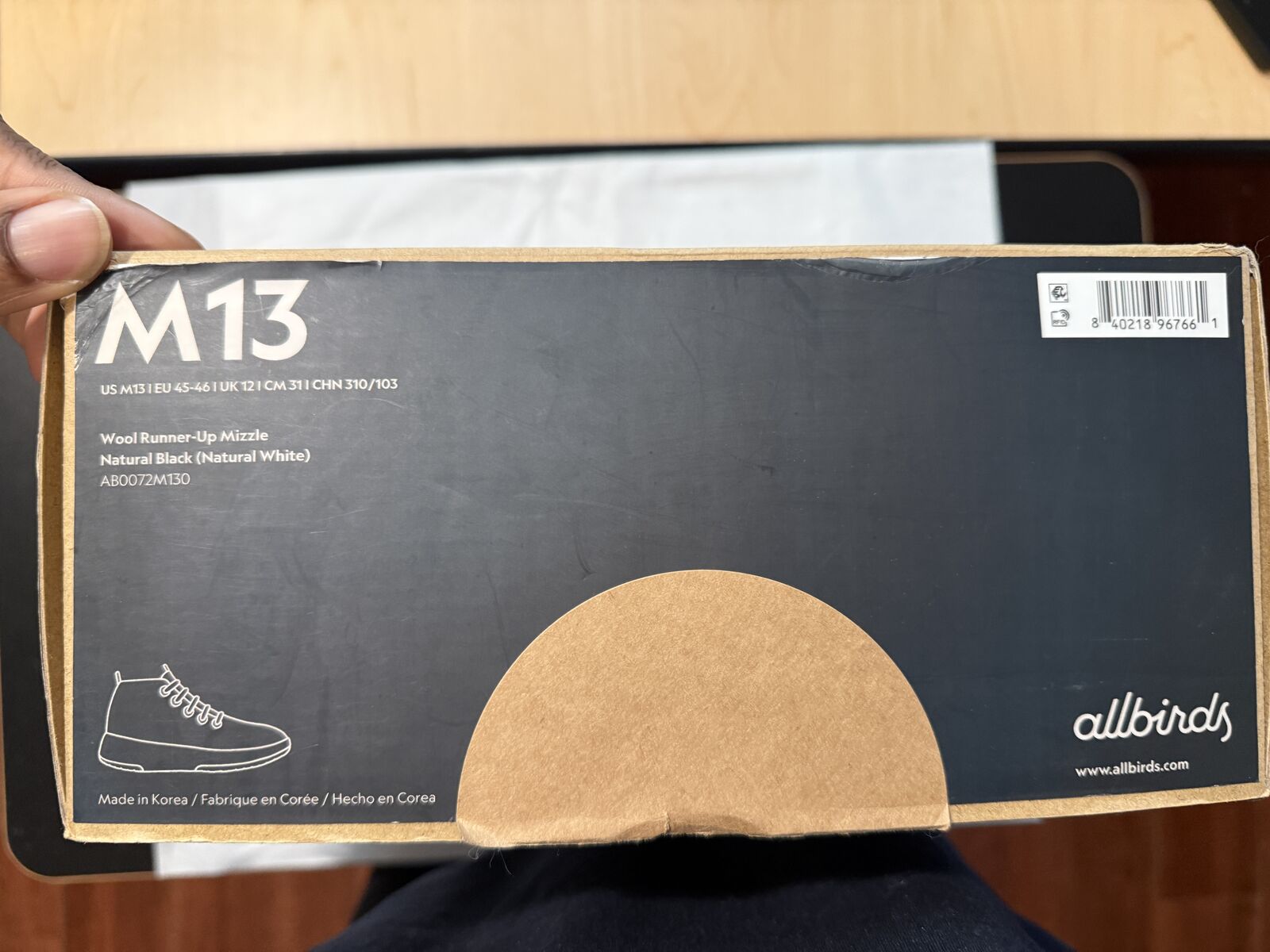 Allbird Wool Runner-Up Mizzles Mens 13 in Natural Black (Natural White) colorway. Lightly used and in great condition. These are the water-resistant high-top sneakers, perfect for Spring, Fall and light Winter weather. Very warm and confortable. Comes in original box and has been well cared for.