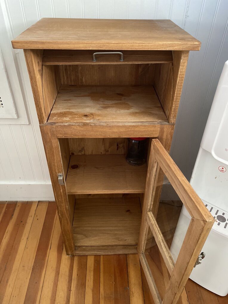 Solid pine, custom design and built in my shop. Features glass inset door with retro design latch, handmade tambor (roll top) door. 17” x 13” x 37”.
