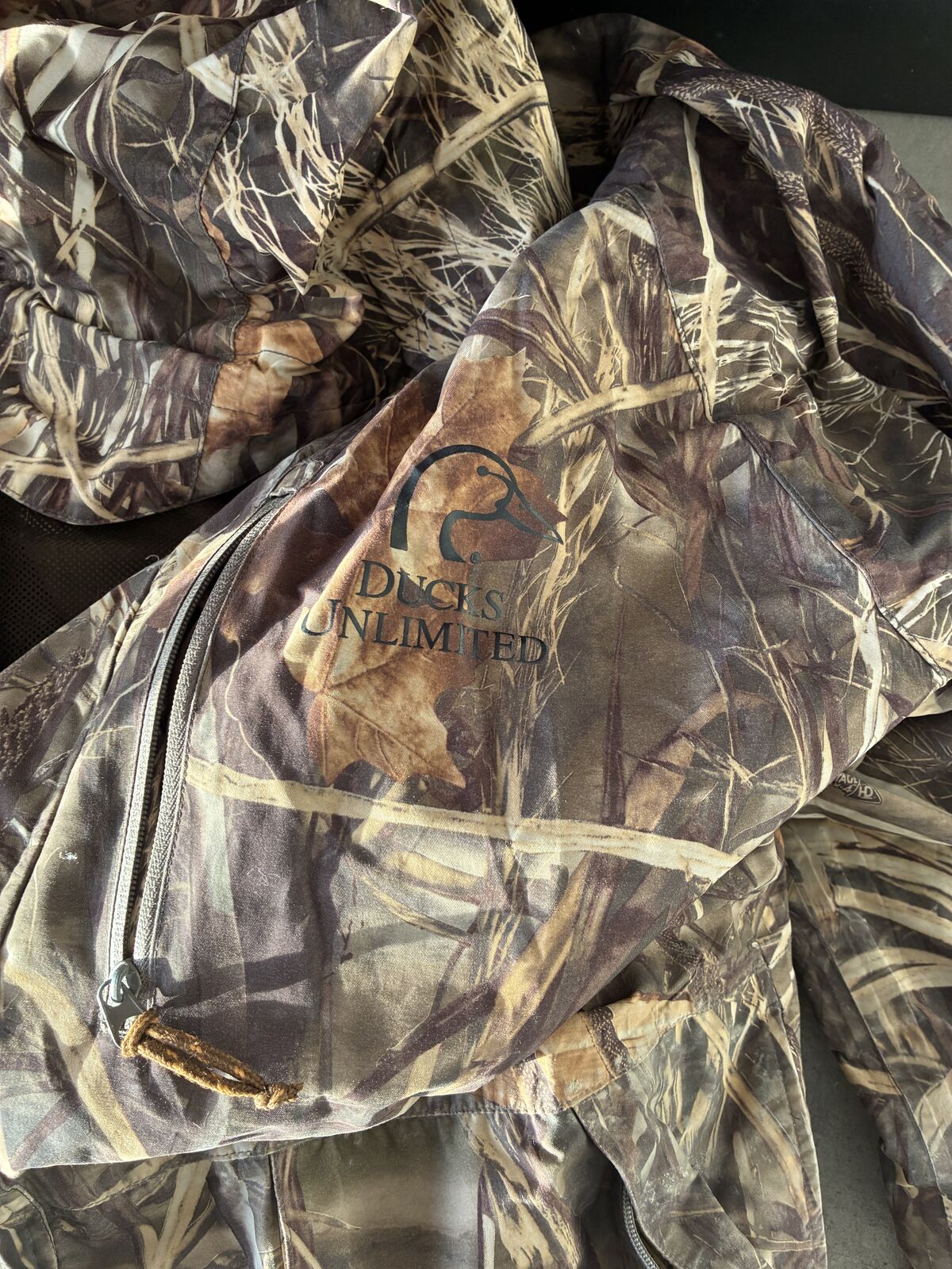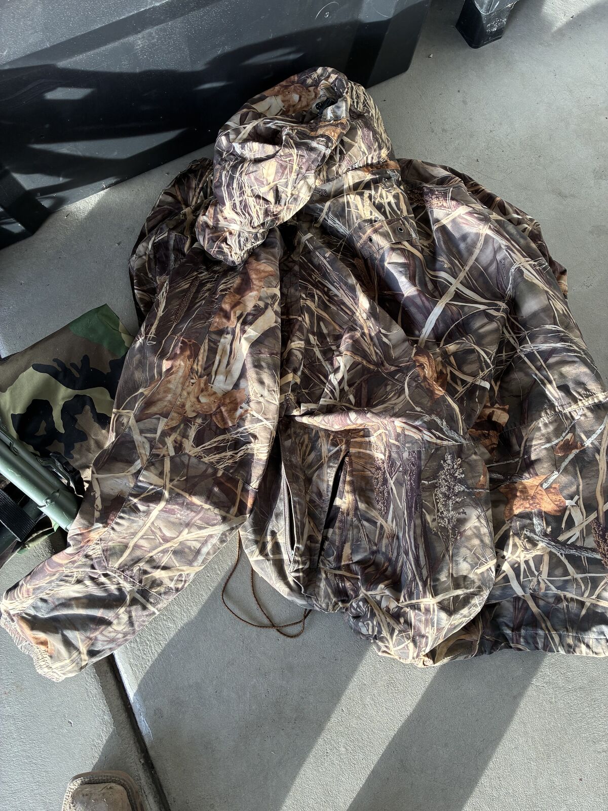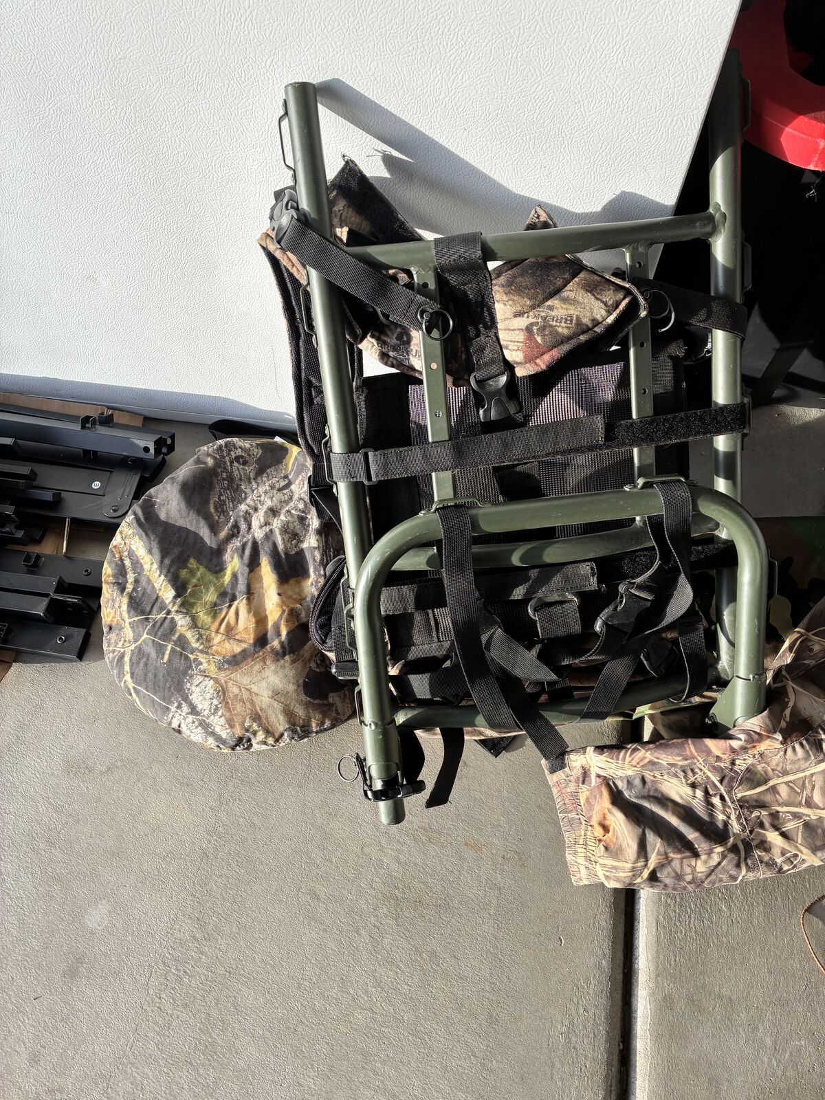 Frame pack, duck hunting coat, and cushion seat.