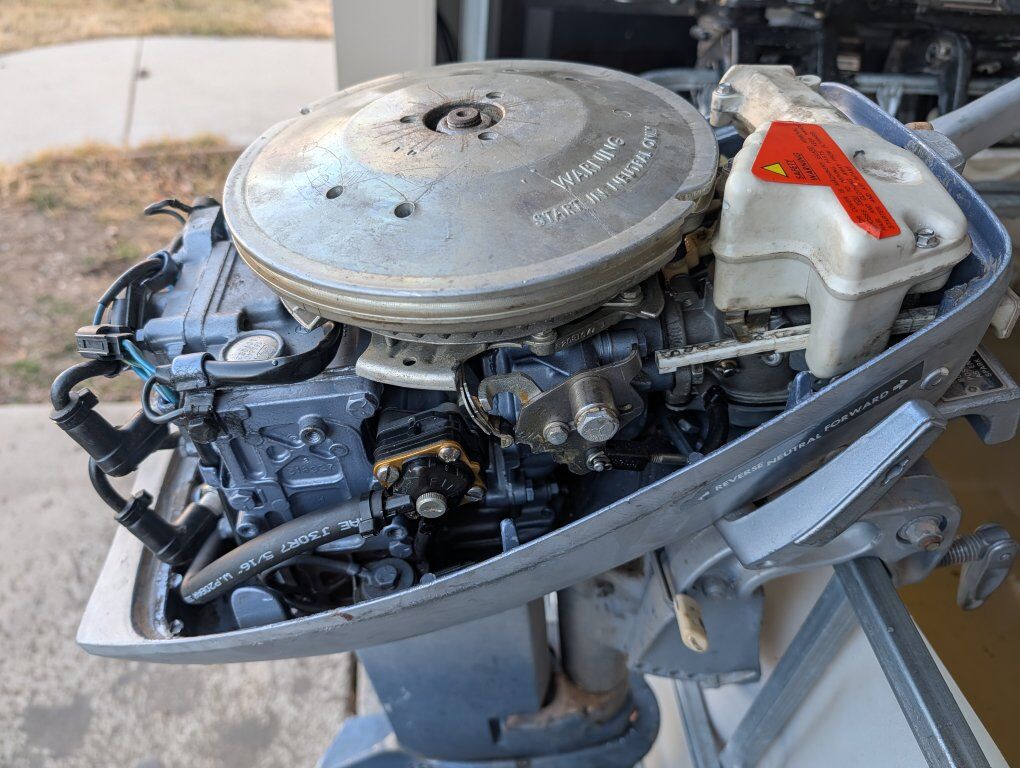 Factory specifications: Engine type: 2-stroke, carbureted Cylinders: 2-cylinder Displacement: ~246 cc (15 cu in class) Ignition: Points ignition (original to this model year) Starting: Manual rope start Steering: Tiller handle Shaft length: approx. 18" Fuel: Premix gas/oil (50:1) Gearcase: Forward / Neutral / Reverse Weight: ~75–80 lbs (approx.) This is a solid, simple vintage outboard—well known for reliability and easy maintenance. Great fit for small fishing boats, aluminum boats, tenders, or as a dependable backup motor. Comes with fuel tank.