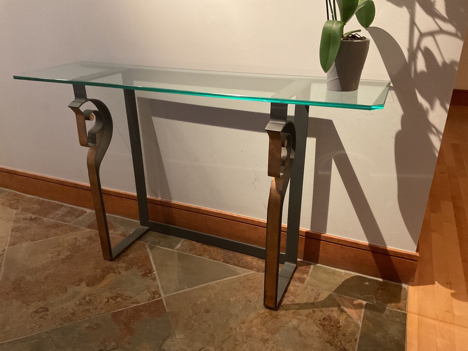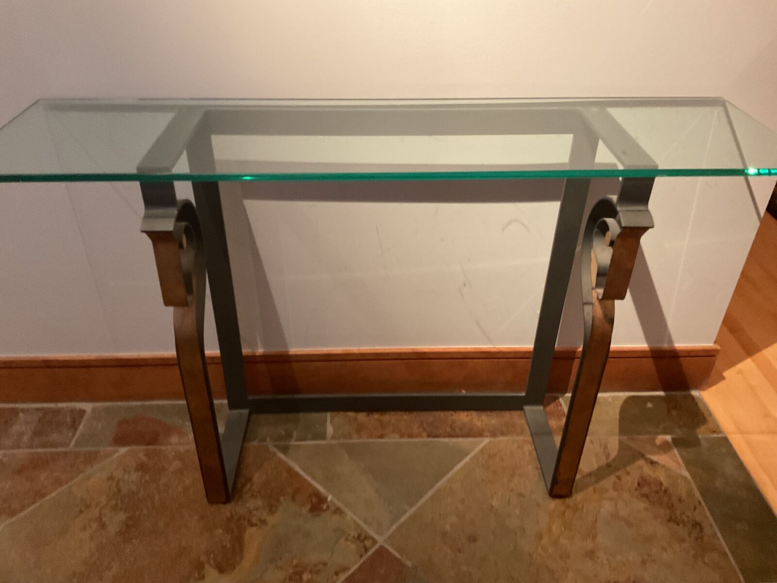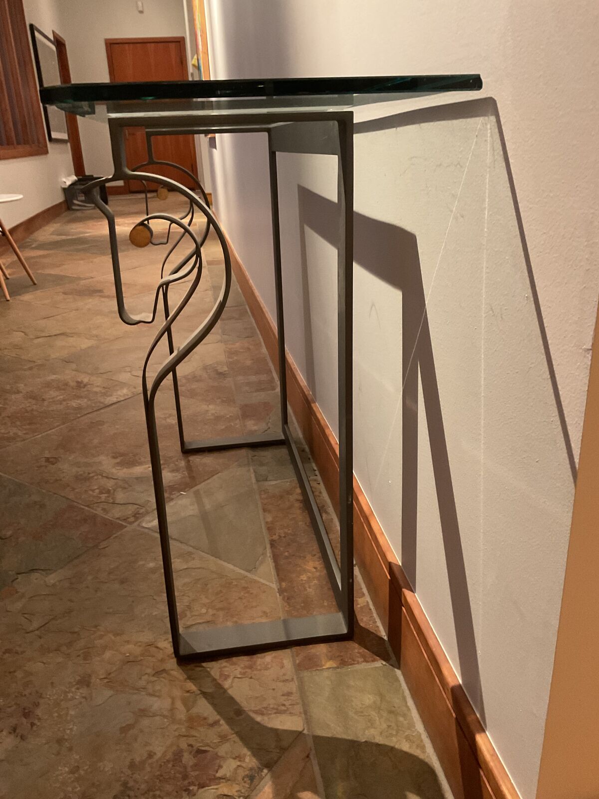 ZelleContemporary side table with glass top & subtle horse design. Steel with gold detail. 52" longx14" deep x 30"" high. 1/2" glass top Perfect to fill that small space with simple elegance.