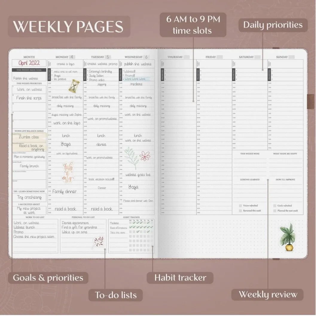 THE ULTIMATE UNDATED, LARGE-FORMAT PLANNER This large-format, undated planner combines effective planning tools and goal-setting frameworks to help you stay focused and productive throughout the year. STAY ORGANIZED, INCREASE PRODUCTIVITY & ACHIEVE YOUR GOALS This hourly planner with 6 AM-9 PM time slots is perfect for planning both your personal and professional lives all in one place. IMPROVE WORK-LIFE BALANCE, BUILD NEW HABITS & FEEL HAPPIER This week and day planner is designed to help you build and support a balanced lifestyle, using a daily habit tracker and monthly check-ins. A4-SIZED, LUXURIOUS & TOP QUALITY This life planner with time slots has a large format (8.5x11 inches). The work planner comes with an eco-leather hardcover, thick 120gsm paper, pen holder, elastic band, lay-flat binding, user guide, and stickers. 60-DAY SATISFACTION GUARANTEE If you arent satisfied with your goal setting planner, we want to hear about any issues you have with business and personal planner and organizer. Reach out to us about appointment book, so we can provide a solution.