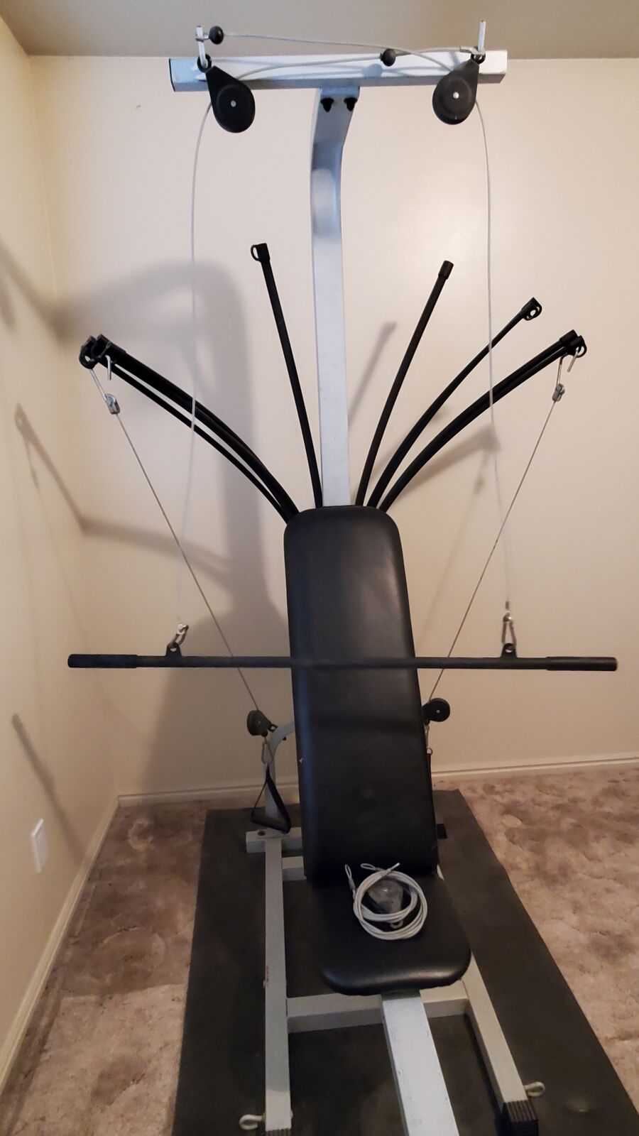 VenmoBowflex home gym for sale $70 OBO. It is marked as a Bowflex Supreme but I can't swear to that. The machine has a total of 210 lbs on the power rods (105 lbs per side). It comes with all the parts you see in the photos including the base mat. It can be used in multiple configurations and the bench will lock into flat or upright positions. Everything is in perfect working order. And, if needed, this machine is extremely easy to move around compared to a heavy free weight bench. User manuals are available on line. I accept cash or venmo.