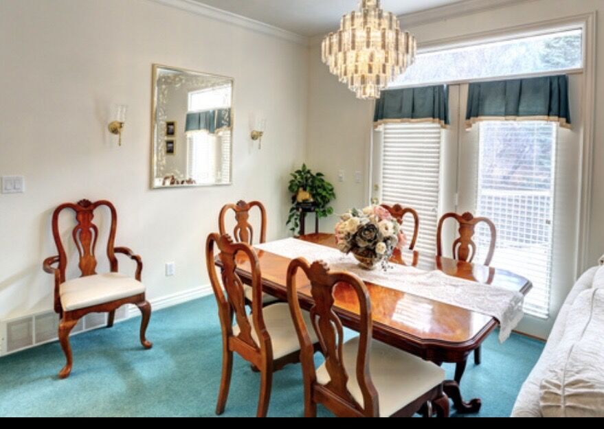 ApplePayVery nice, high end dining room set. Solid wood! Comes with two leaf inserts to extend it, and 6 chairs. Excellent condition.