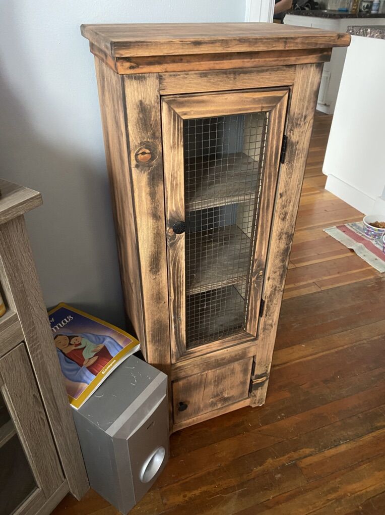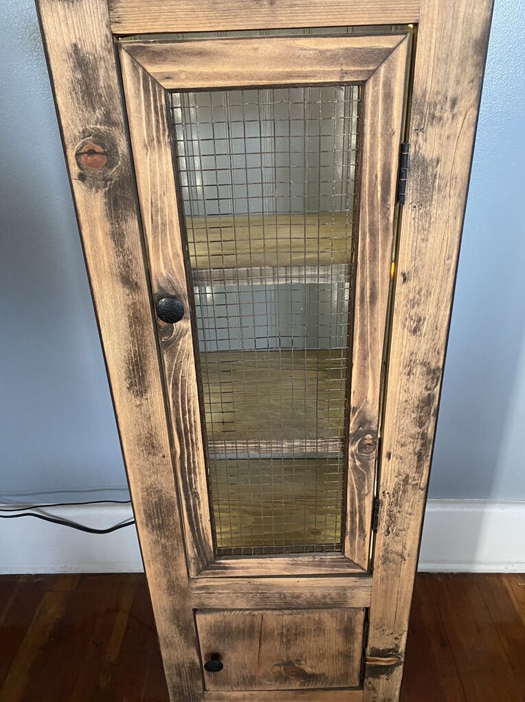 16” x 11” x 39” handcrafted retro style solid Pine custom cabinet with interior LED lighting with remote control. Has box wire inset door on top and solid panel door on bottom. Custom two tone stain finish