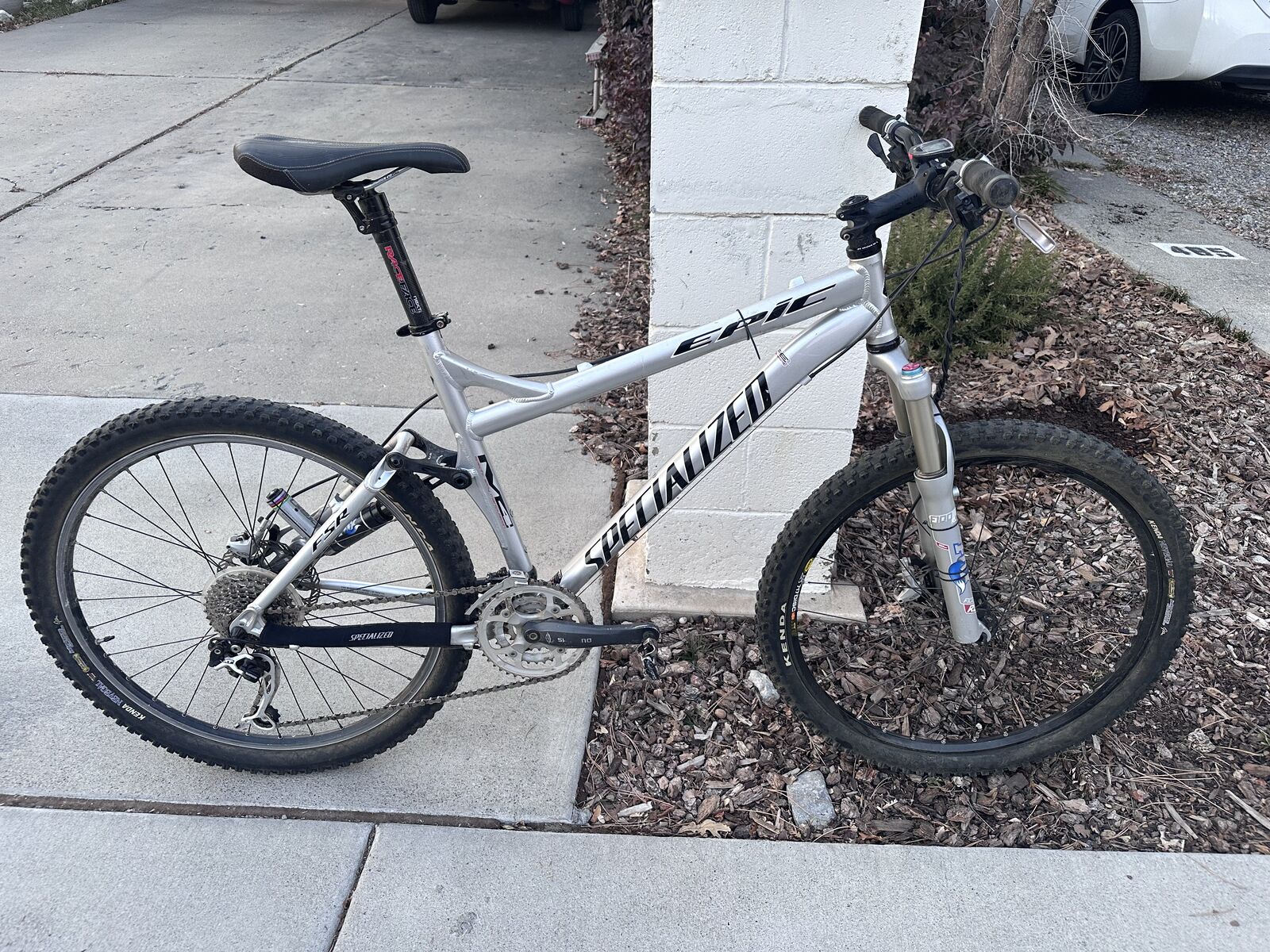 VenmoSpecialized mountain bike. Aluminum frame. Full suspension. Just had the shifters lubed and adjusted. Shocks in good shape. Needs new front brake caliper but that's it.