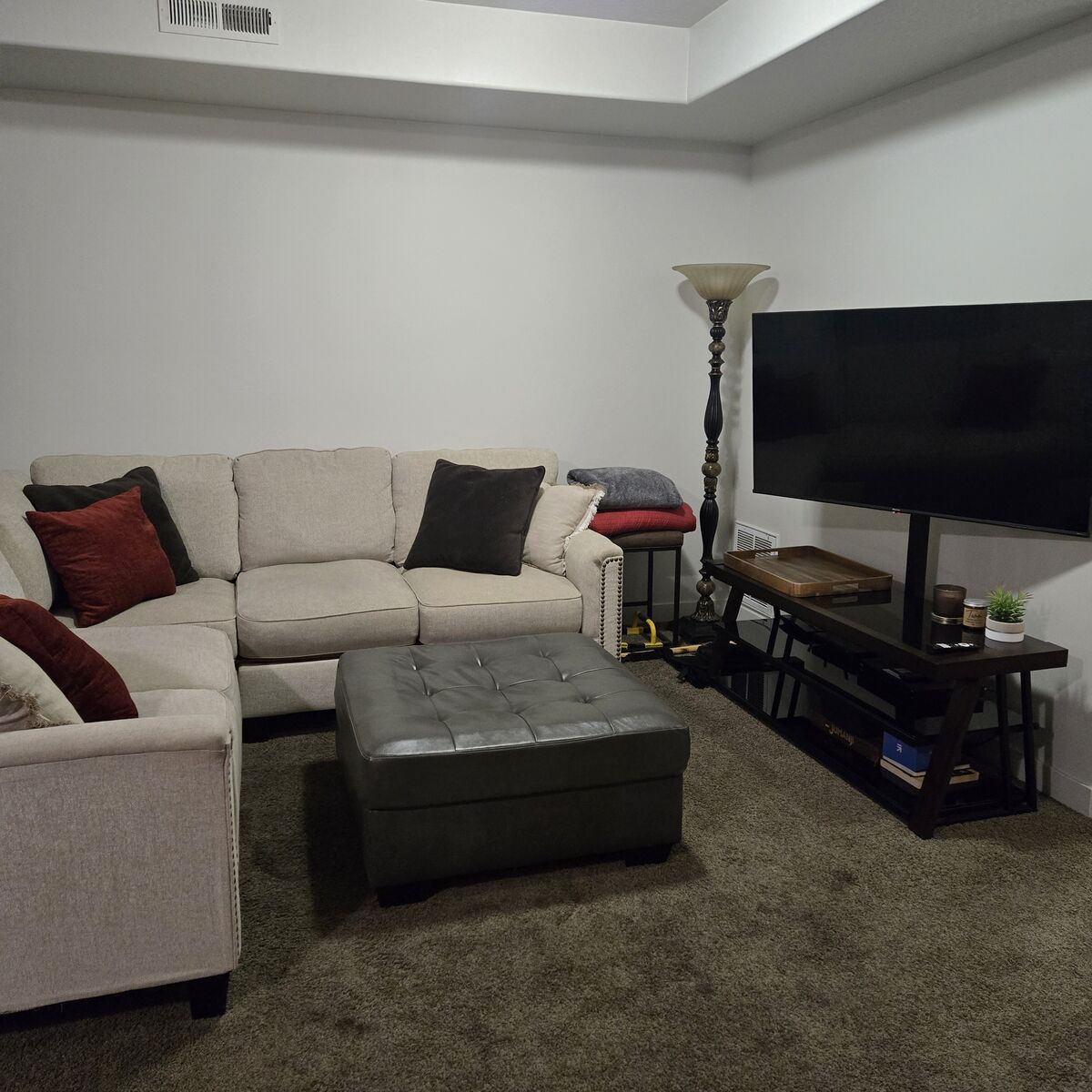 ZelleLarge Sectional Couch & Ottoman for sale. ( All cushion covers are removable and washable) Lovely cream colored and textured fabric. Super cool leather ottoman that adds contrast and functionality. Couch measures 8’ x 8’. Ottoman is 36” x 36”.