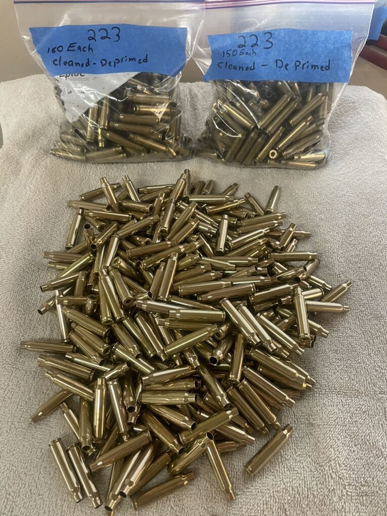 brass casings, once shot cleaned and ready to reload. Available calibers 9 M M. 300 per pkg for $20 40 caliber 200 for$16 45 caliber 200 for $20 38 special. 200 for $20 223 150 for $20 300 blackout. 200 for $30 6.5 creedmore. 100 for $25