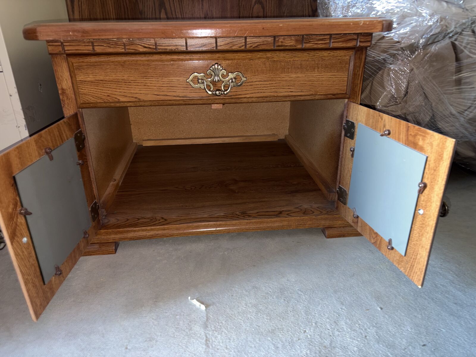 Cute vintage nightstand in good condition for its age. The cupboard doors open and close well and work great for storage. The drawer front is decorative only.