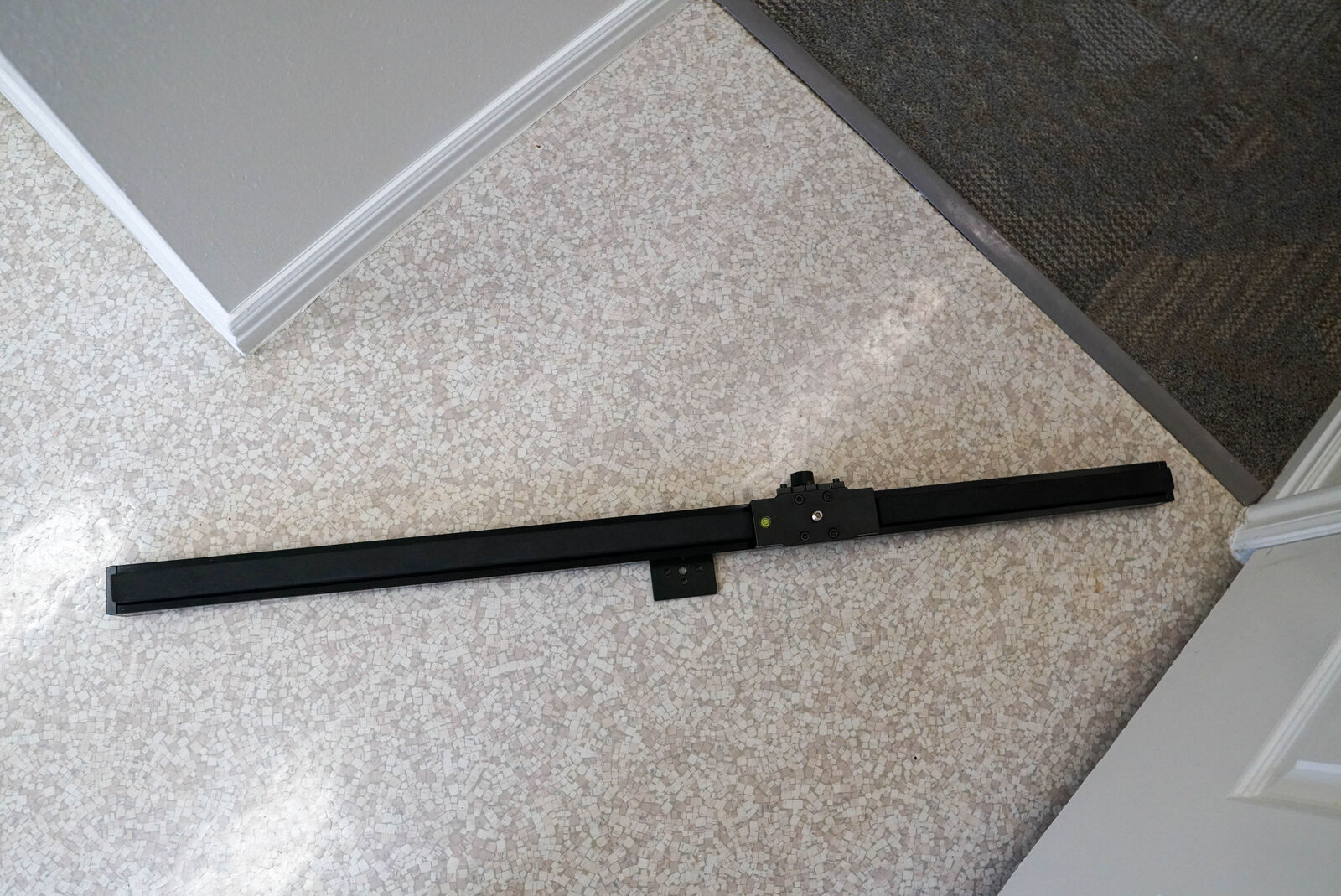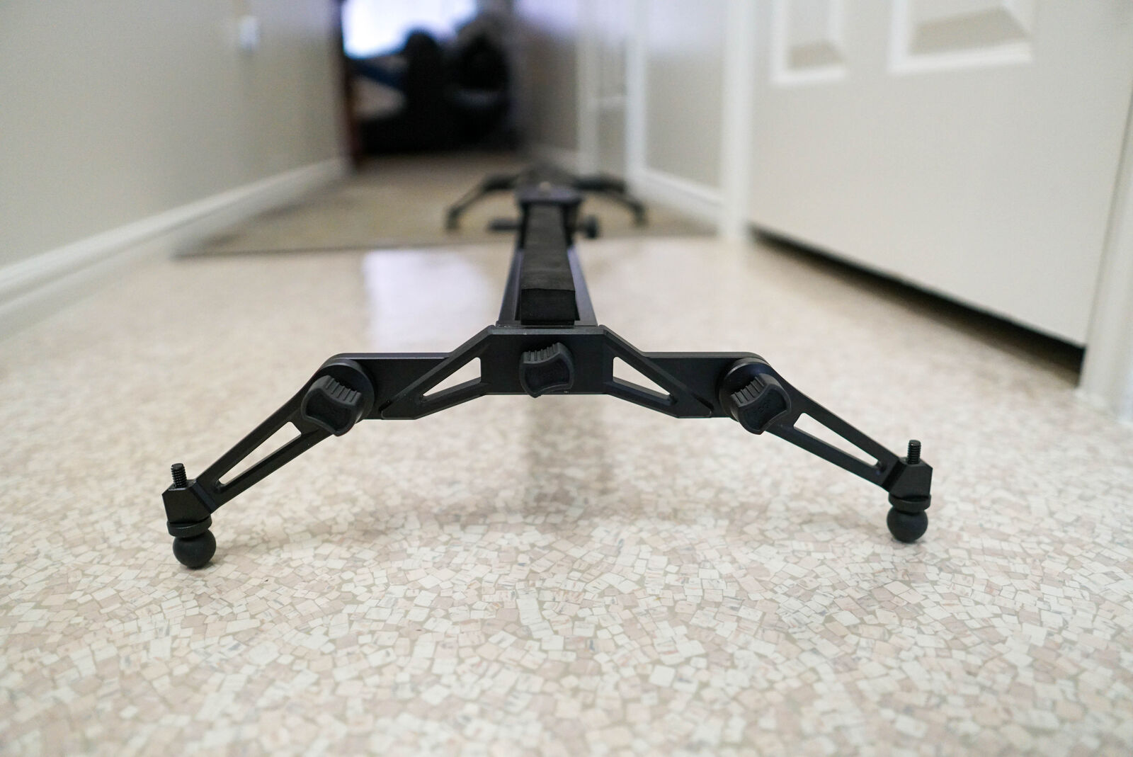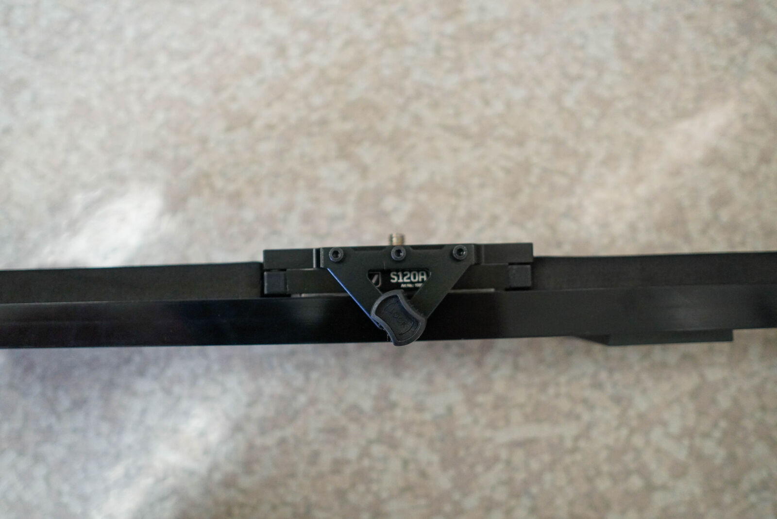 VenmoF&V S120A 42" camera slider. Full 5" of linear movement end to end. Has a 3/8"-16 male thread, the standard for mounting tripod heads. Adjustable legs for leveling. Can be mounted on a single tripod or with two tripods on the end-caps. Maximum load capacity of 30 lbs and the slider weighs 9.8 lbs.
