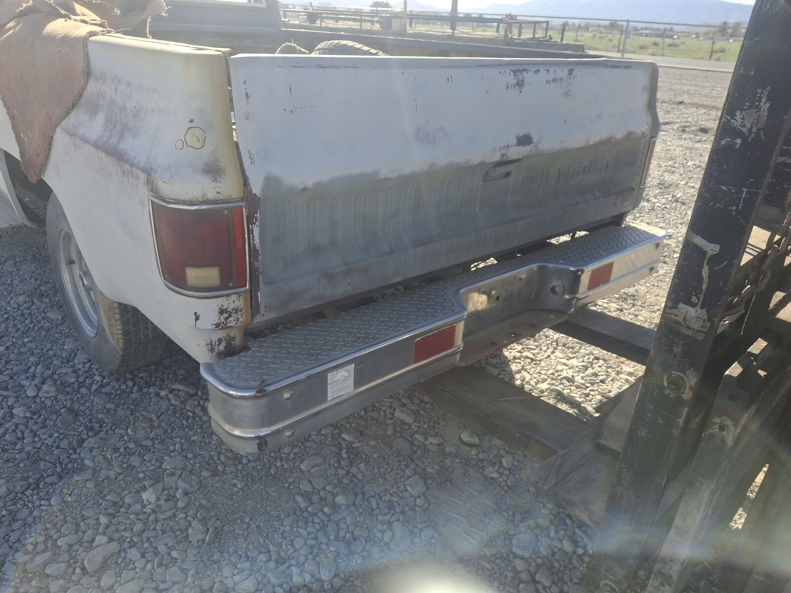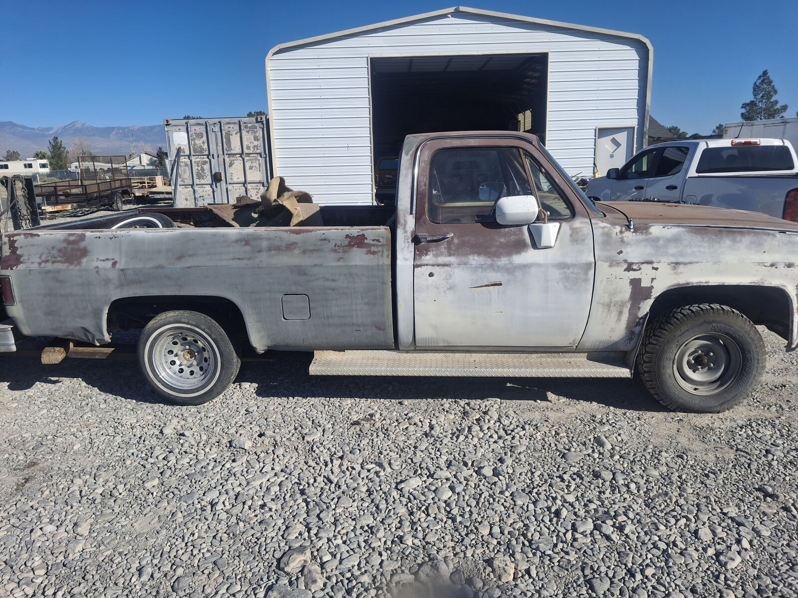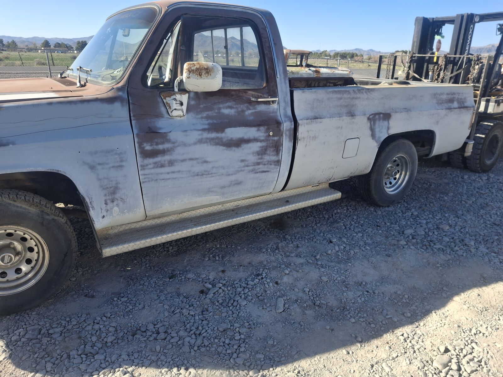 99% rust free chevy long bed 1/2-ton, 2-wheel drive, pickup. the cab floor has shinny paint on it. no engine, manual transmission included. cab & cab floor, cab corners, rocker panels, hood, doors, bed, tailgate are all rust free. no title, bill of sale. the hood is not bent by the hinges; the bed has damage behind the right rear wheel.missing the seat. located 60 miles from Veegas in Pahrump. NV. call/ text 920 279 6504 with questions / offers