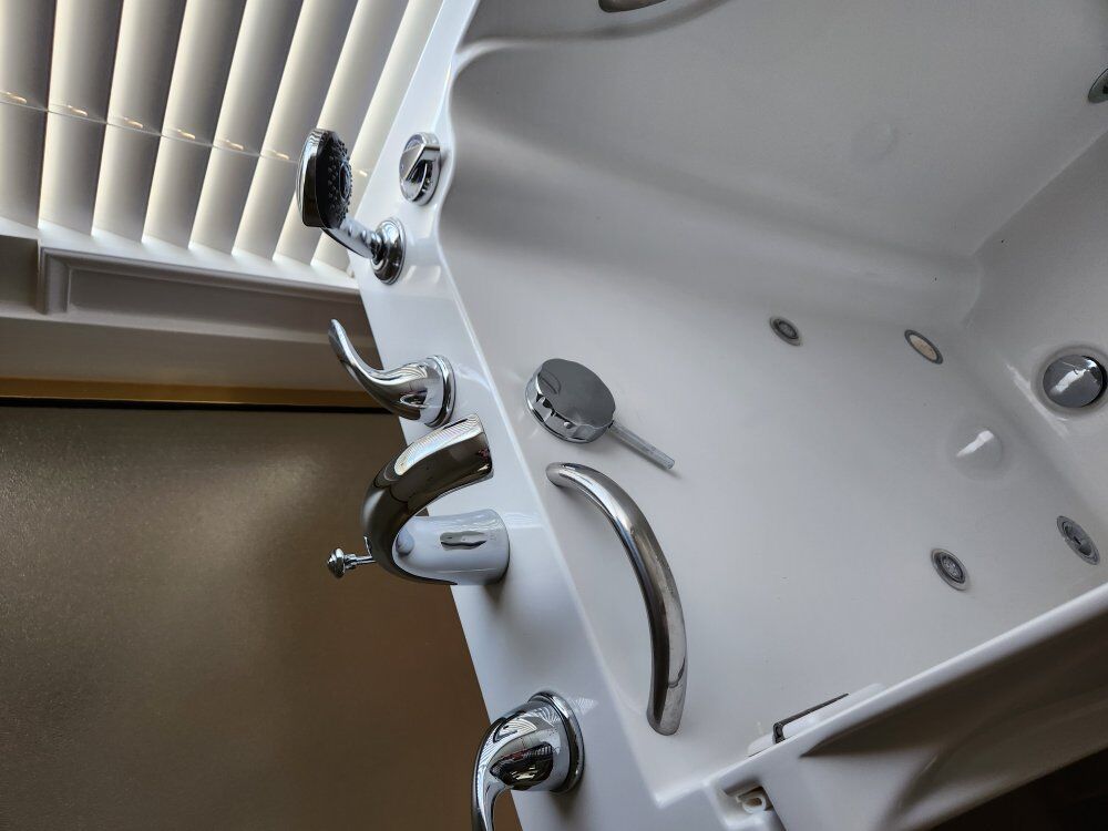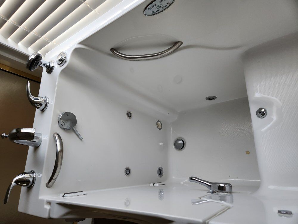 Features several jets, shower head, opening door, "help" button, handrails, and a comfortable seat.