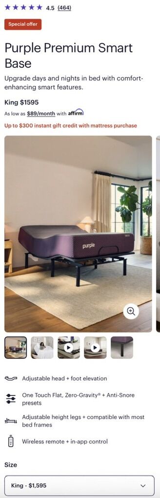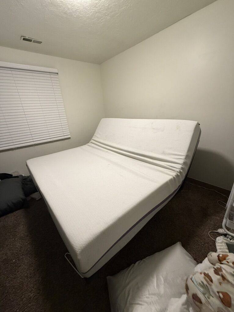 VenmoThe purple mattress has a couple stains on it, but overall isn’t perfect condition and it’s pretty comfortable. The base has a couple wiggly legs, but besides that it works perfectly and the bed can be controlled with a remote that comes with it or by an app. I will also include a mattress protector cover. Brand new the set is almost $4000.