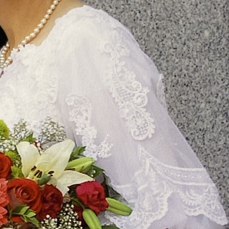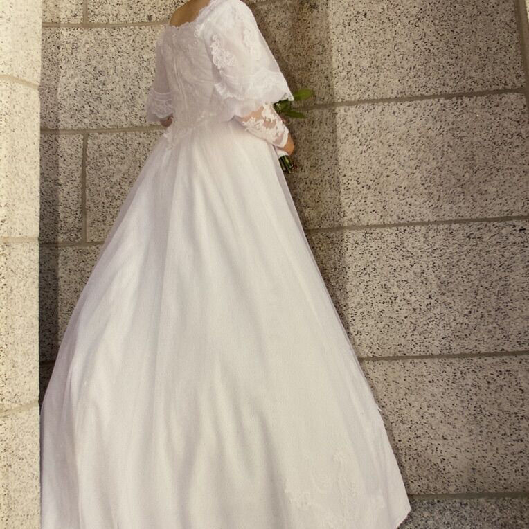 ZelleElegant A-line temple ready wedding dress. Beaded bodice. Appliqué lace on tulle over satin. Train can be buttoned up. Excellent condition. Worn by a size 10-12 height 5’6”. Heirloom quality cleaning. Message for more details.