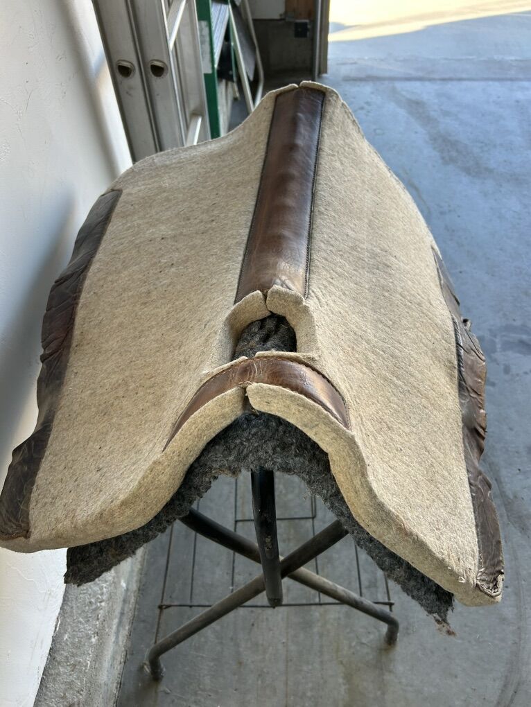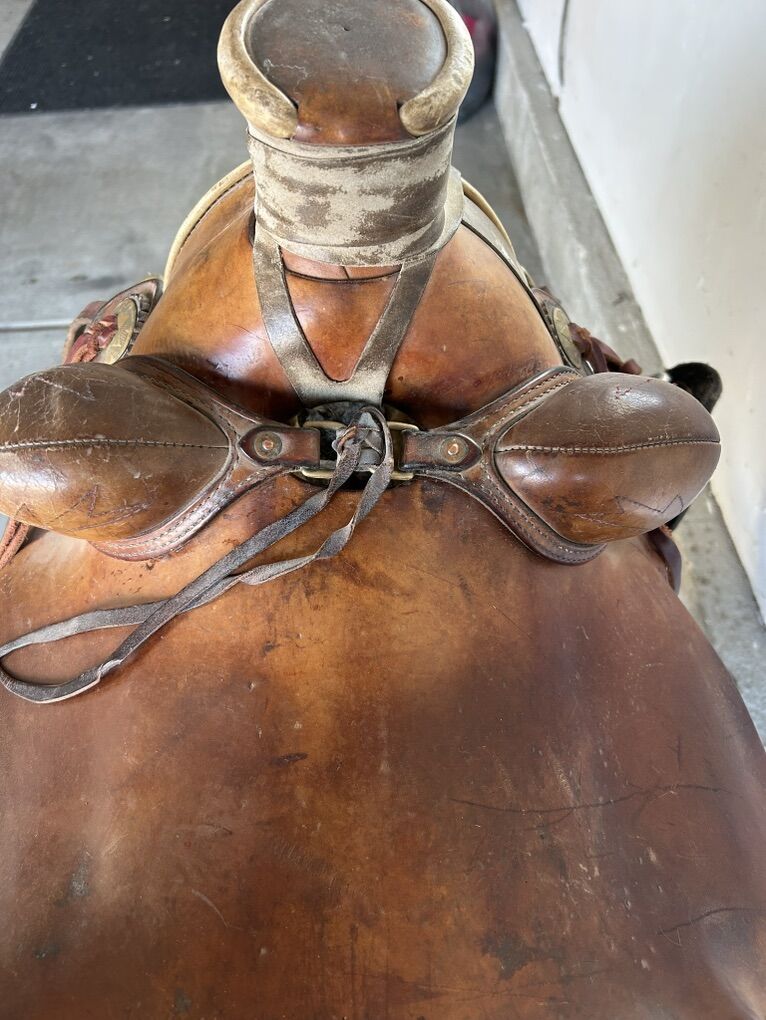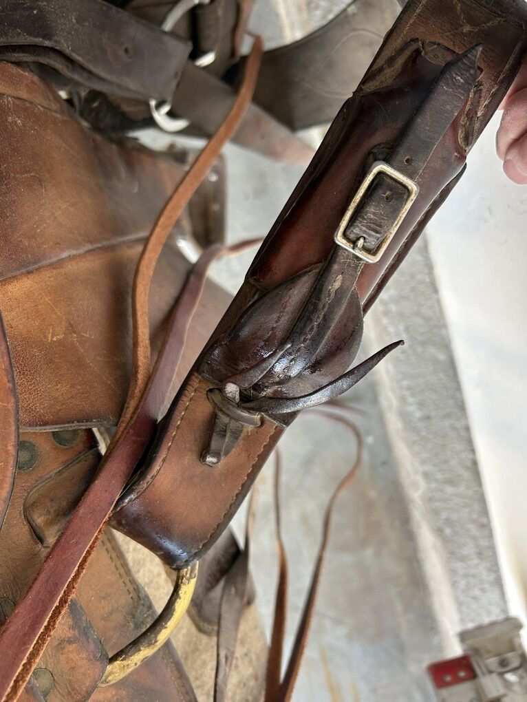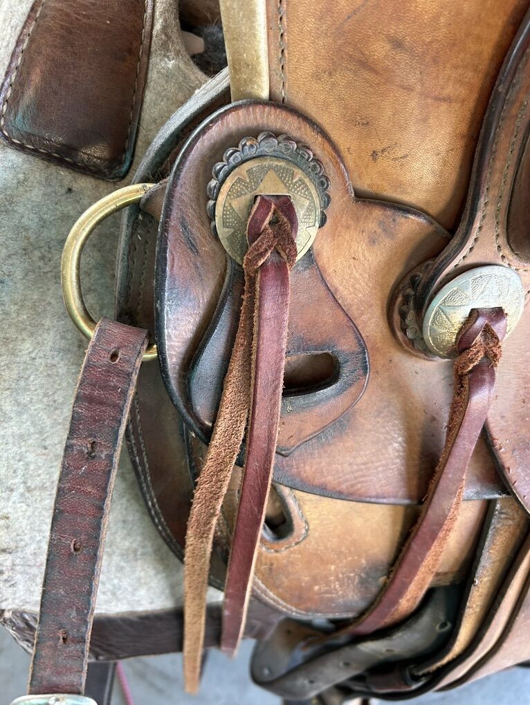 Leather cinch and straps are all thick. Stirrups are oversized and trimmed. Concho‘s and real brass rings are all secured and in good shape.