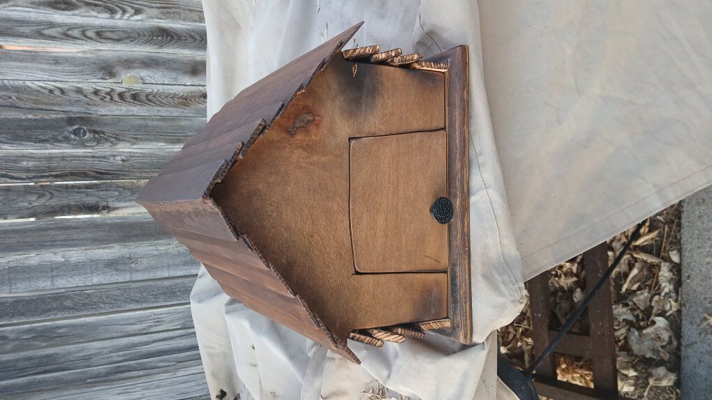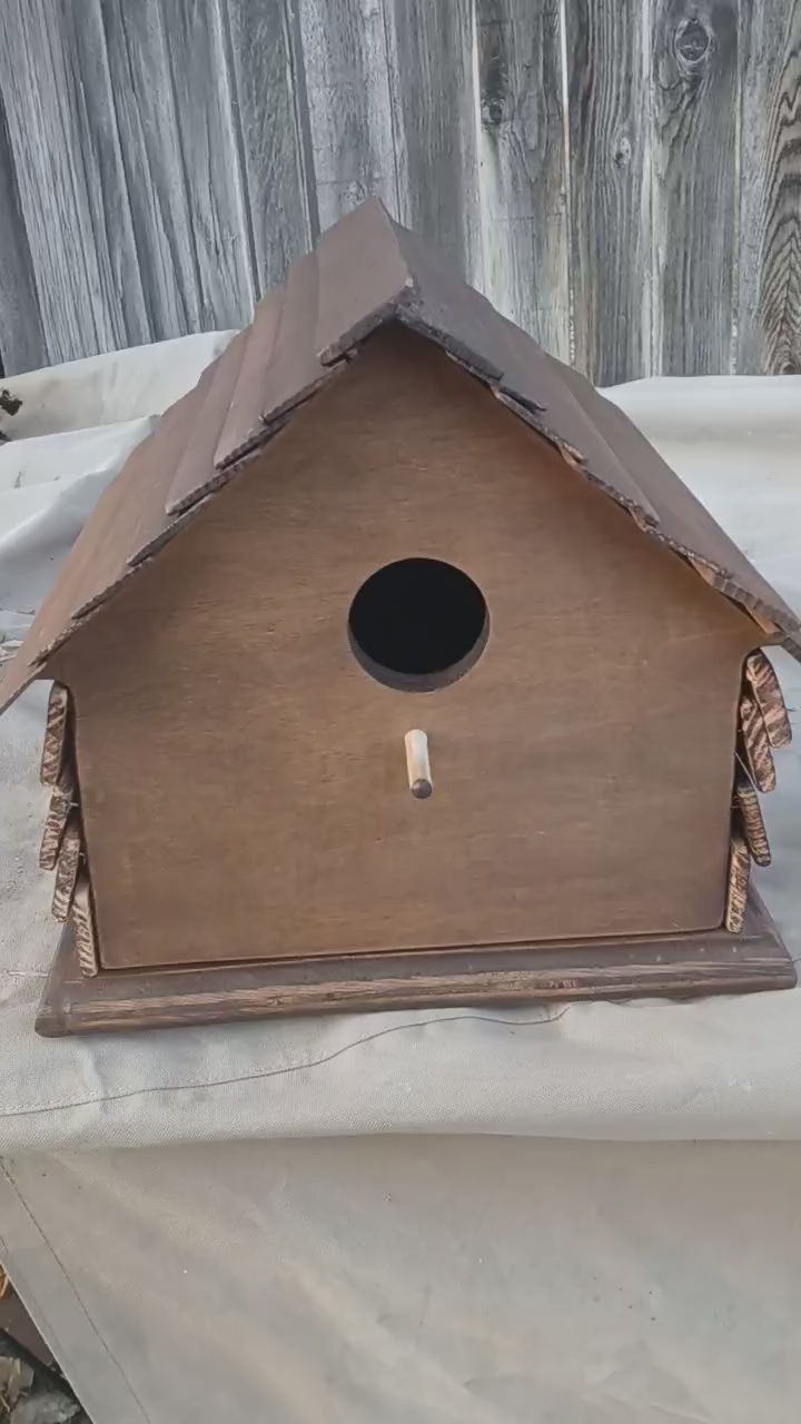 ZelleBase, front, and back is made from 3/4 inch high quality plywood finished with a dark walnut stain. The shiplap is made from Douglas fir with the sides having a burnt/ stained finish. The roof having a rich dark walnut finish. Easy opening in the back for easy clean out. Dimensions: Base 1sq ft Wide/ deep 11in Height 10 in Weight around 5lbs