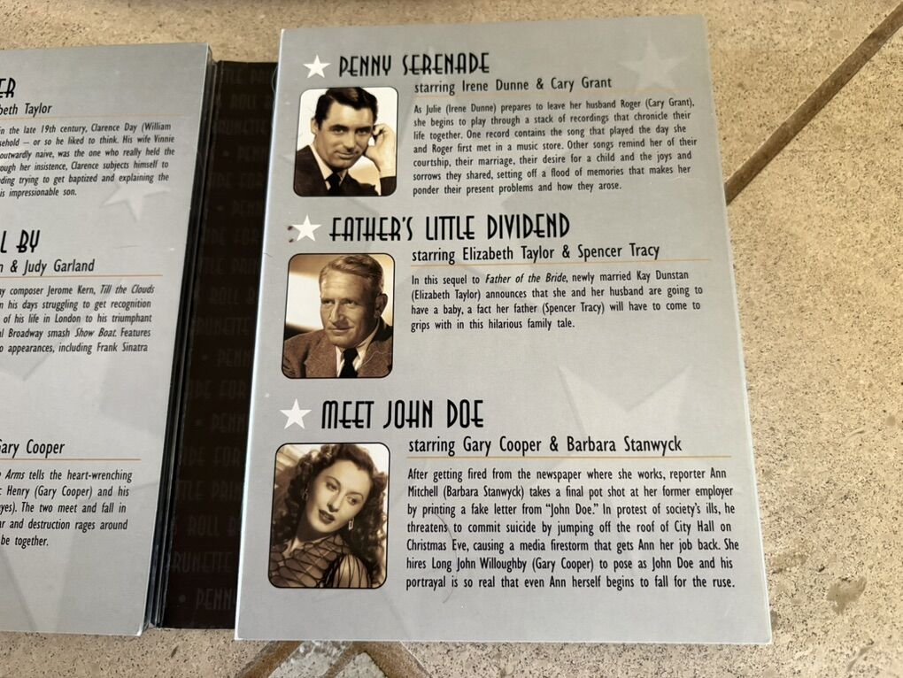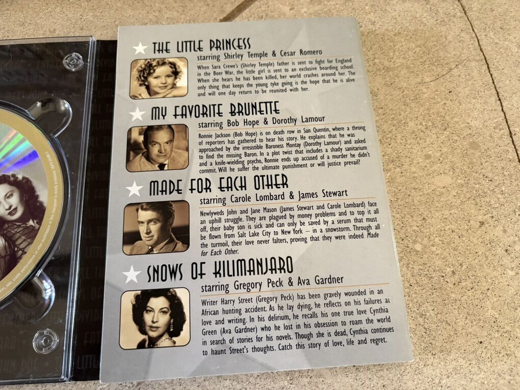 I have a metal tin with a collection of 5 DVDs inside. They’re called Hollywood Classics The Golden Age of the Silverscreen. It has 10 classic movies. The DVDs are in great shape with no scratches or smudges. See the pictures for the movies. There’s also a little booklet with pictures and info for the main actors. See my other ads for jewelry, artwork, home decor and more.