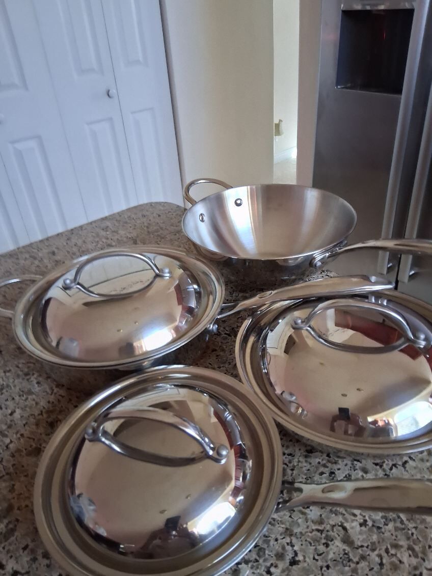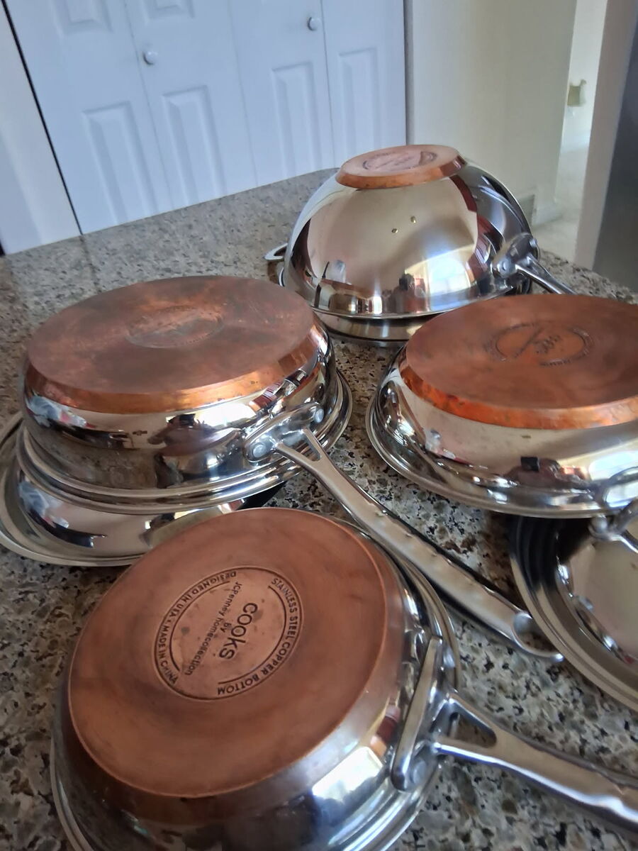 4 pieces vintage (3 pans,1 wok and 3 lids) Cooks Copper bottom by JCPenney home collection, lids are interchangeable. 2 pans diameter are 10", 1 pan is 8" and a wok is 10". Used but in excellent condition like new for $35.
