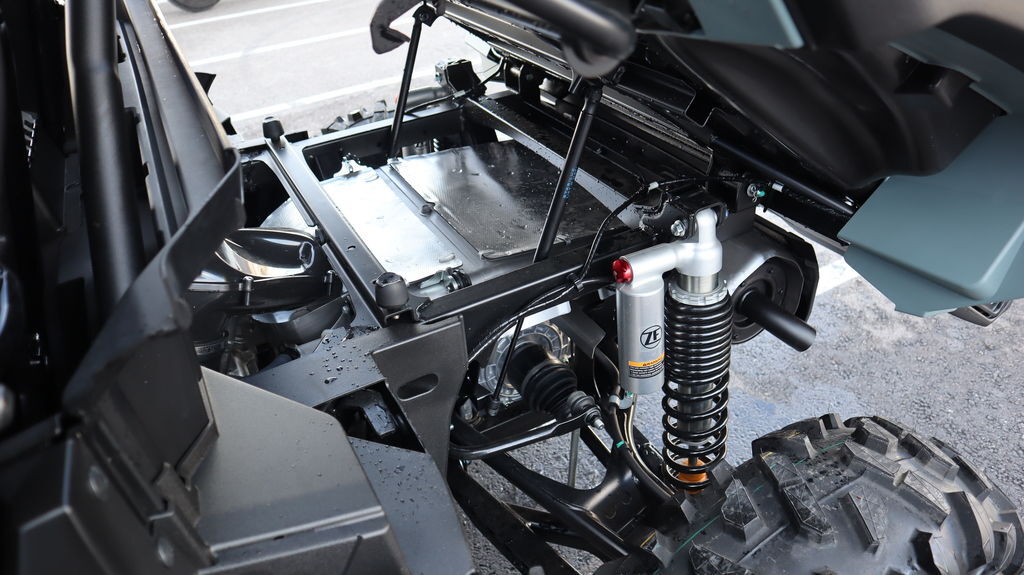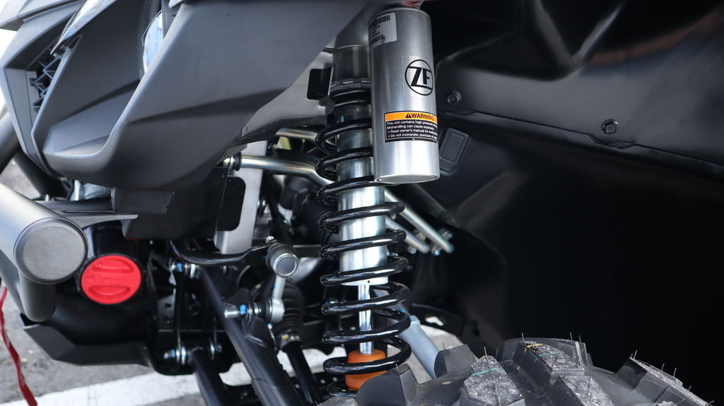 Trail-ready suspension includes sway bars and SACHS ZF piggyback shocks with high and low-speed compression plus preload adjustment, delivering 13.3 inches front and 15.5 inches rear travel, paired with all-wheel disc brakes using large 207mm vented rotors and two-piston calipers for confident stopping power.