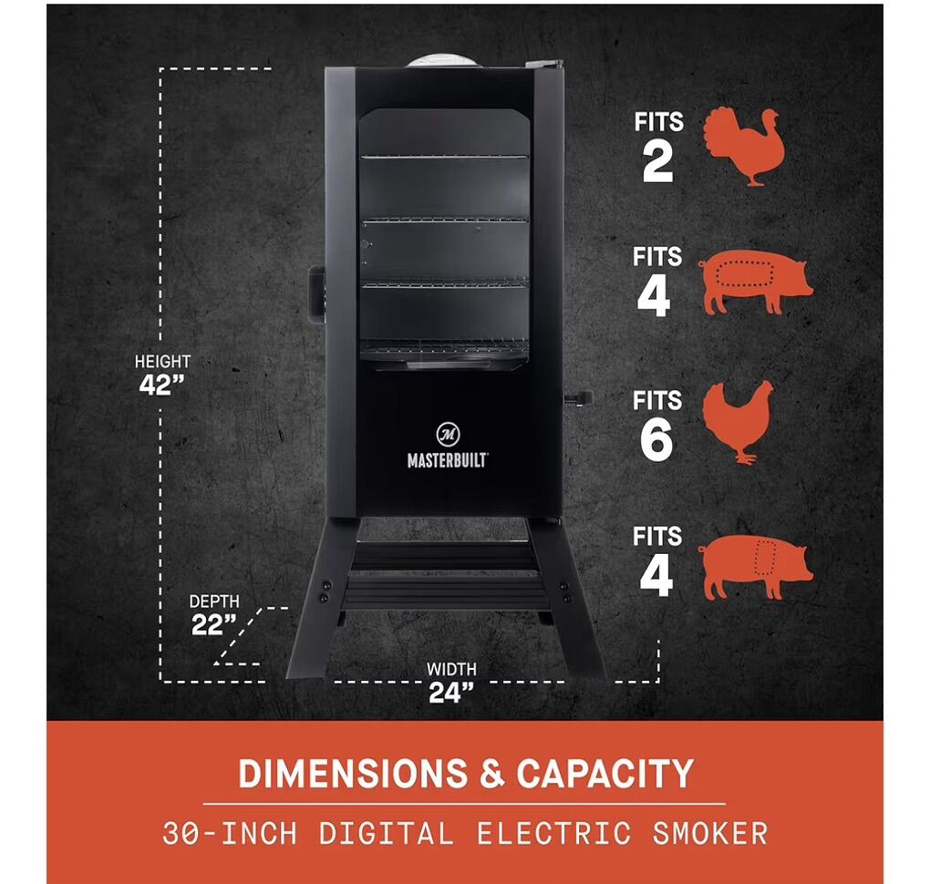-Temperature reaches up to 275˚F -Digital panel controls on/off, cooking temperature and time -711 sq. in. of smoking space to feed the whole family -4 chrome-coated smoking racks -Thermostat-temperature control for even, consistent smoking -Fully-insulated body retains heat -Water bowl to add moisture and flavor -Air damper for smoke control -Removable drip pan and rear grease tray catches food drippings