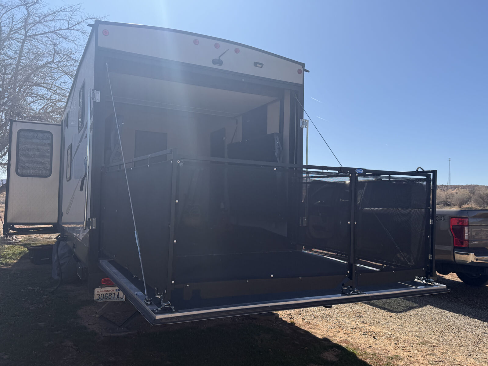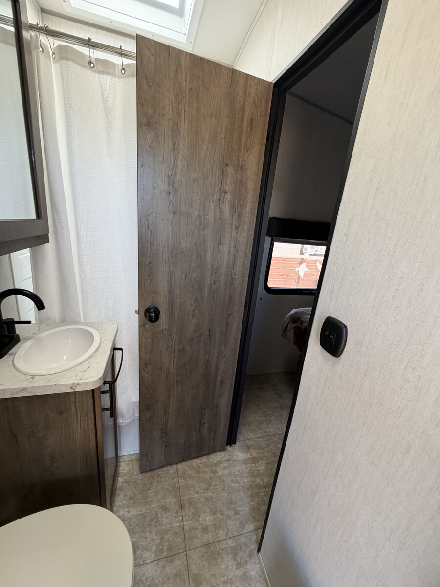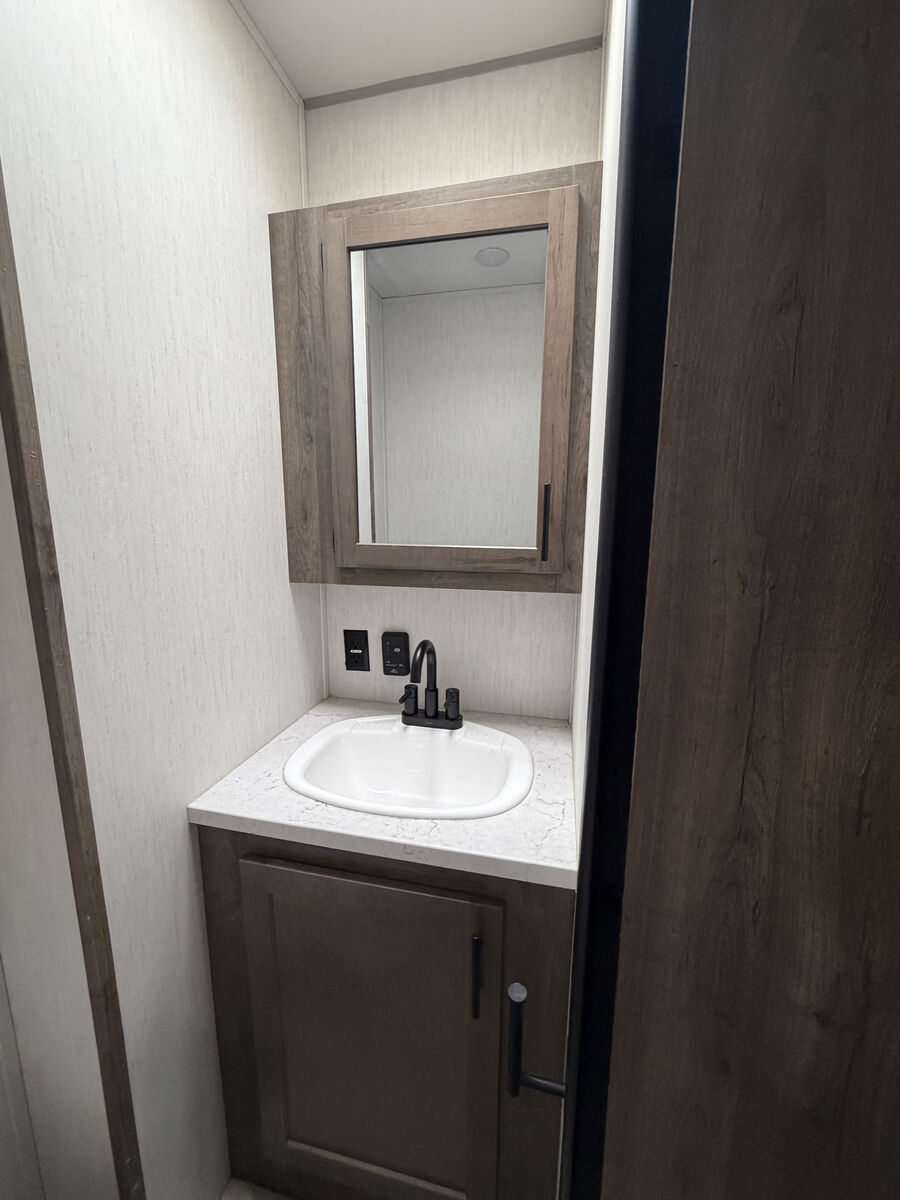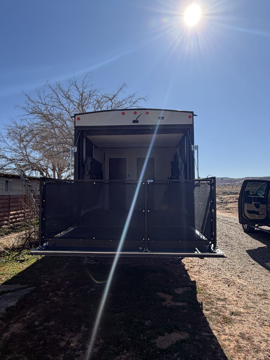 The spacious 12' 6" separate garage was used as a mobile office - has tons of room for whatever you want to do in there. You can sleep four in the garage with the two roll-over sofas and the quick set queen bed system, plus there is a half bath here for convenience. The main living area has dual opposing slides for added space, a large pantry to store snacks galore, and a sofa with a table where you can enjoy your coffee at each morning. The full bath has its own private entrance into the front bedroom where you'll enjoy the Rogue king bed and dual wardrobes. Additional features are the zebra shades that will keep light out, a glass shower enclosure, ultracold heated holding tank pads, and much more. There is an outside shower with hot and cold water so you can fill the dogs water bowl or wash the mud from your riding gear, and the enclosed underbelly will allow you to extend your camping season. You will love the look of the residential black stainless steel farm sink, along with the seamless countertops and LED interior lighting with accents.