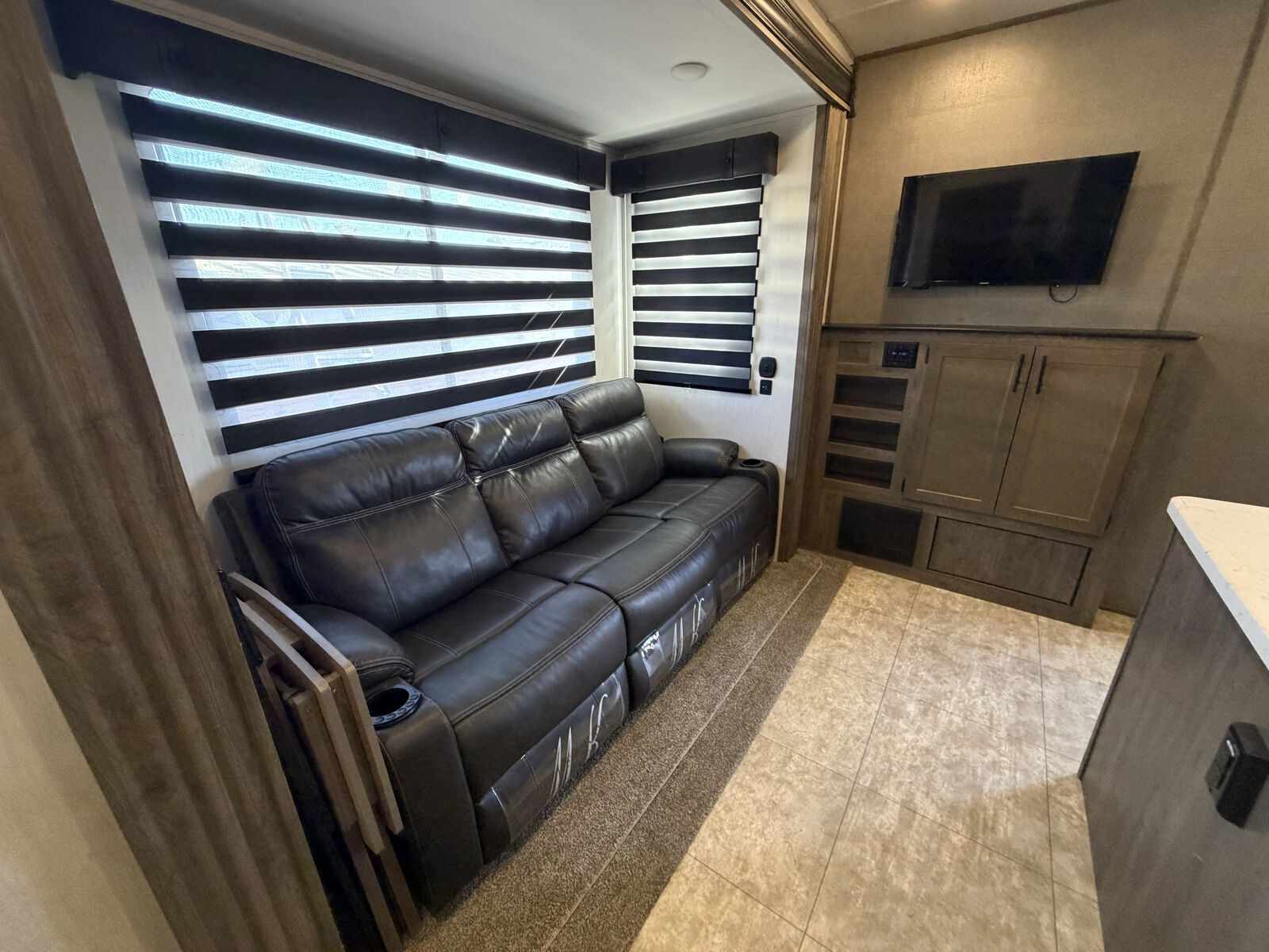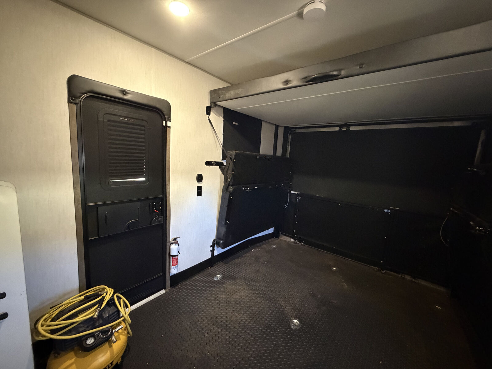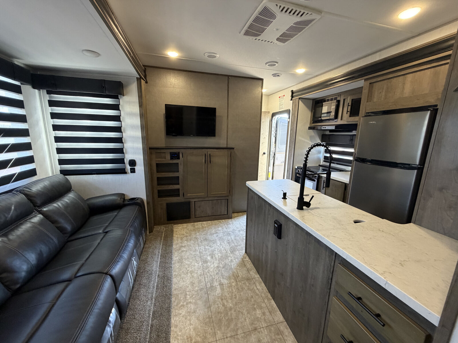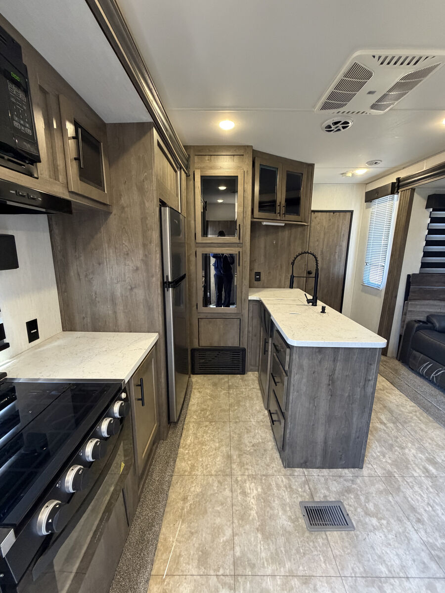 The spacious 12' 6" separate garage was used as a mobile office - has tons of room for whatever you want to do in there. You can sleep four in the garage with the two roll-over sofas and the quick set queen bed system, plus there is a half bath here for convenience. The main living area has dual opposing slides for added space, a large pantry to store snacks galore, and a sofa with a table where you can enjoy your coffee at each morning. The full bath has its own private entrance into the front bedroom where you'll enjoy the Rogue king bed and dual wardrobes. Additional features are the zebra shades that will keep light out, a glass shower enclosure, ultracold heated holding tank pads, and much more. There is an outside shower with hot and cold water so you can fill the dogs water bowl or wash the mud from your riding gear, and the enclosed underbelly will allow you to extend your camping season. You will love the look of the residential black stainless steel farm sink, along with the seamless countertops and LED interior lighting with accents.